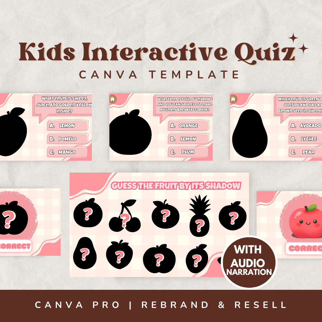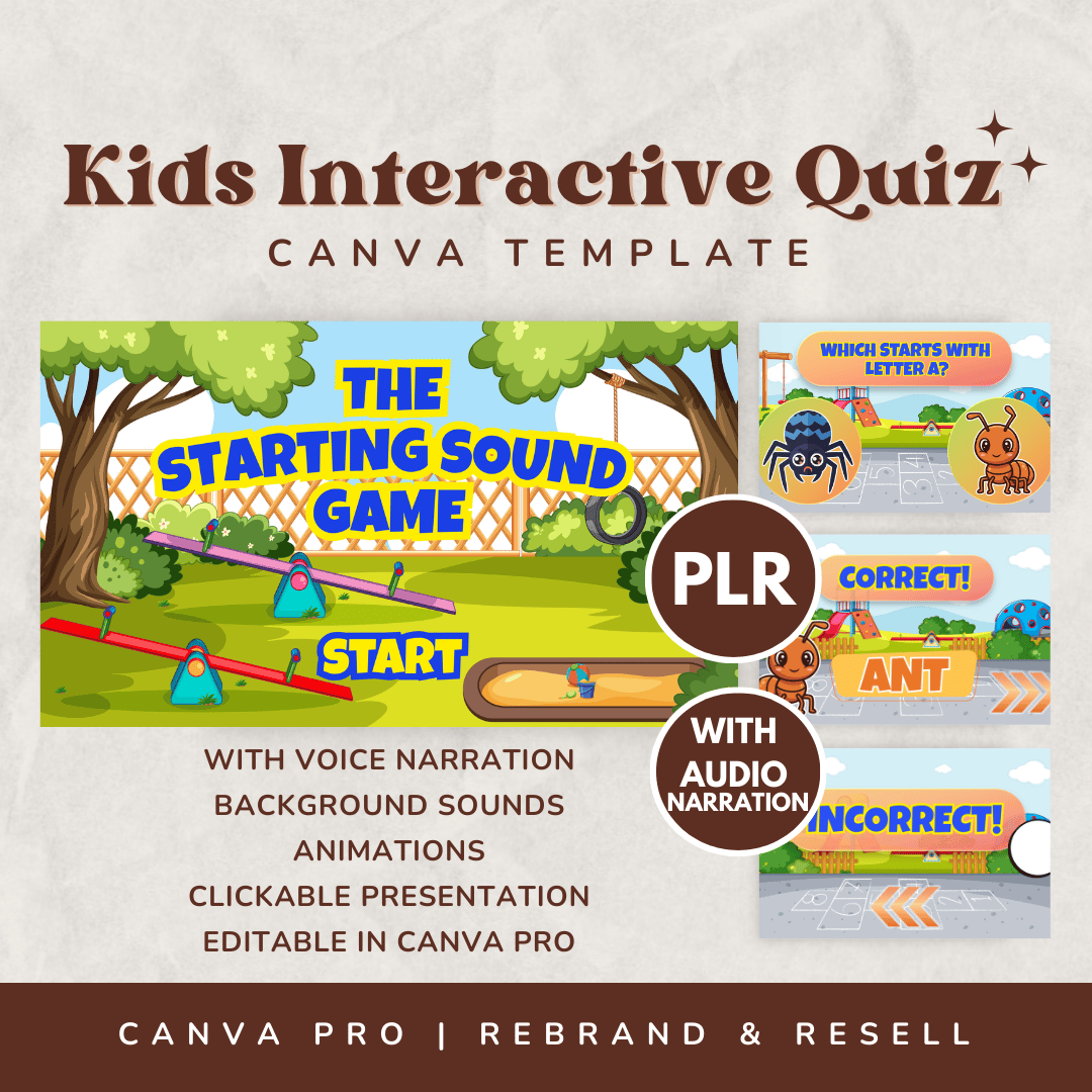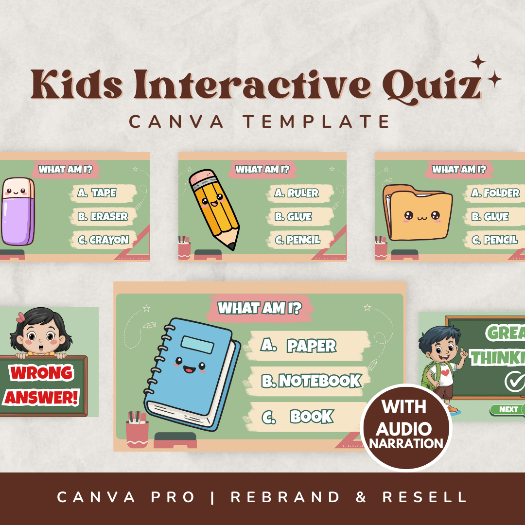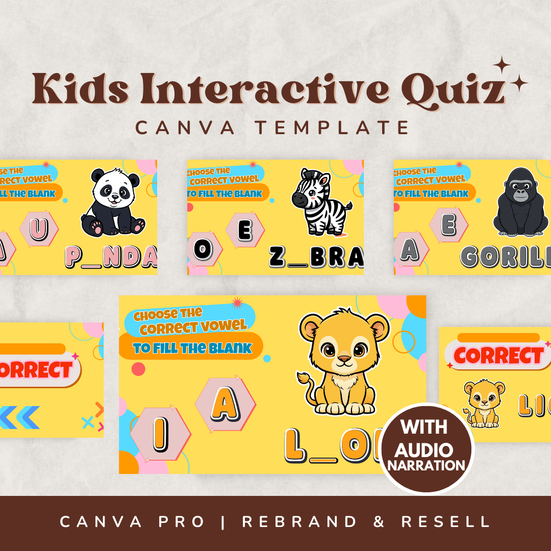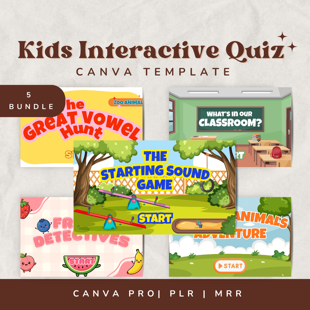 5 Kids Interactive Quiz Game, Educational, PLR, Editable in Canva Pro, Animated