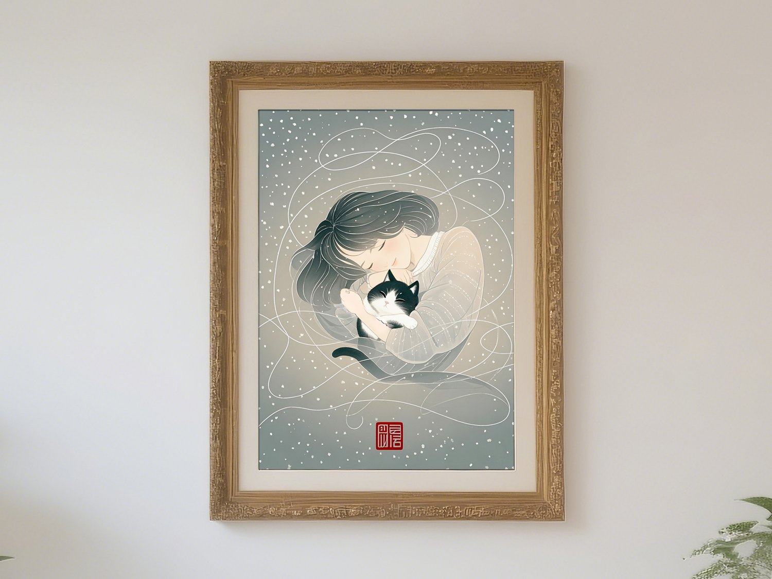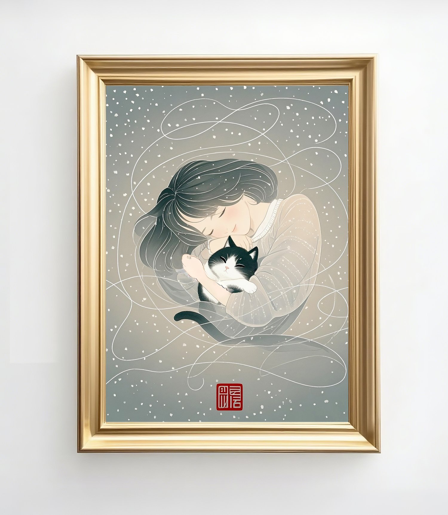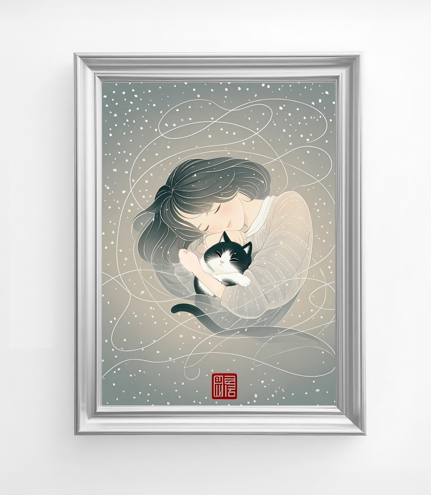 This artwork captures a serene and heartwarming atmosphere through its soft color palette and delicate linework. The scattered snowflakes in the background are irregular and organic, enhancing the dreamlike and tranquil mood. The gentle expression of the woman and the relaxed posture of the black-and-white cat create a comforting sense of intimacy. The white swirling lines evoke a sense of wind or flowing memories, adding both movement and poetic charm to the composition. The traditional red seal adds an elegant, Japanese-inspired touch, making this piece ideal as a gift poster or as calming wall art.