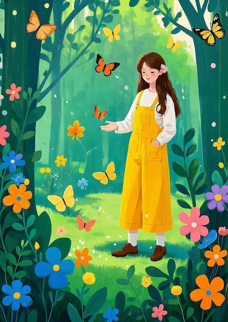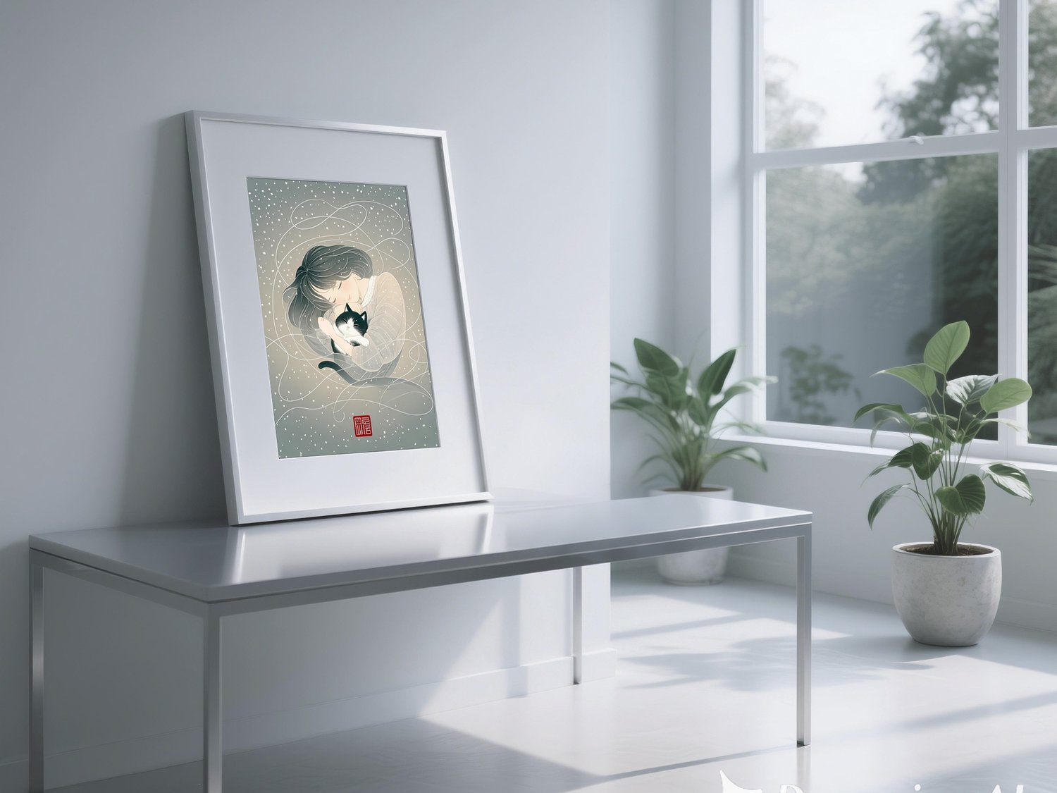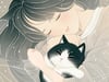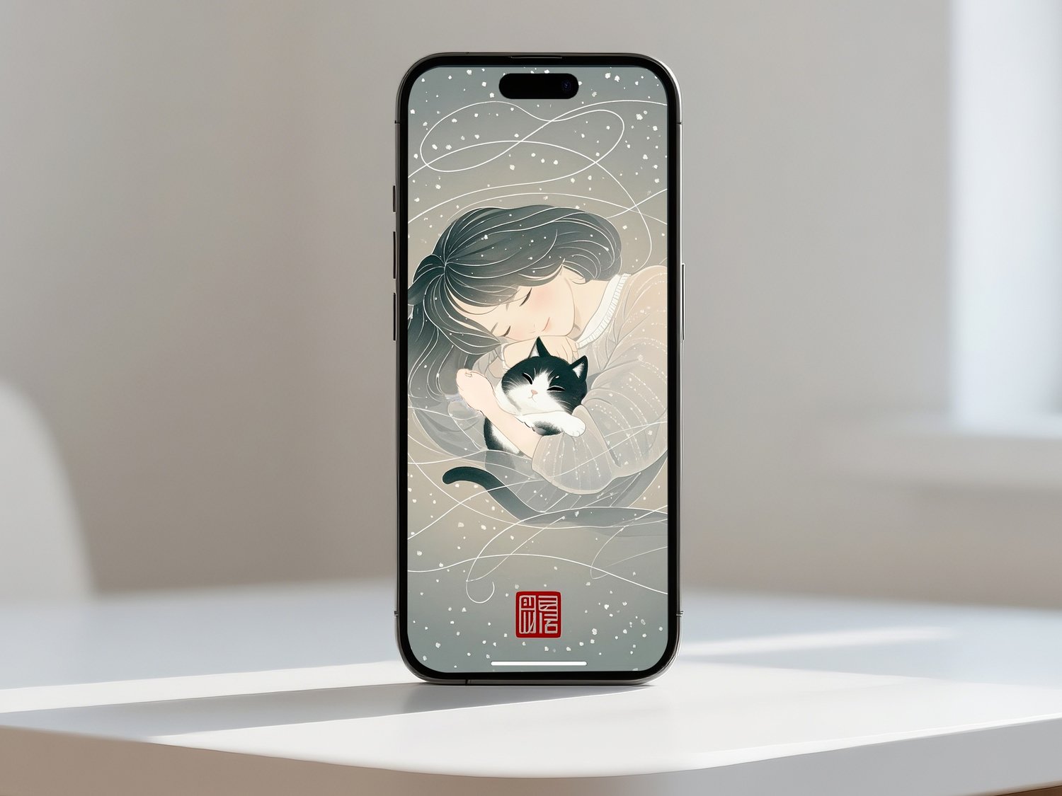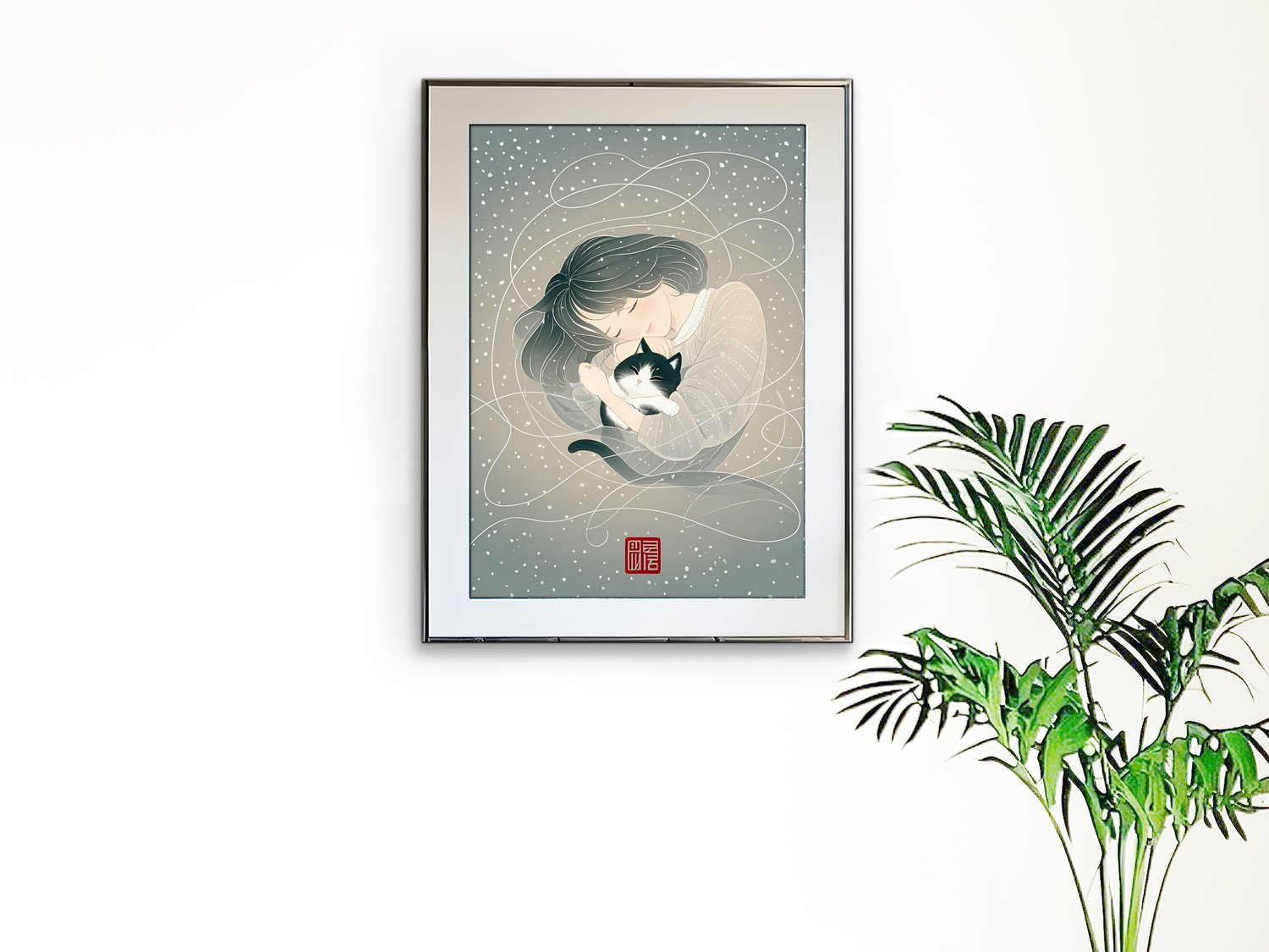 This artwork captures a serene and heartwarming atmosphere through its soft color palette and delicate linework. The scattered snowflakes in the background are irregular and organic, enhancing the dreamlike and tranquil mood. The gentle expression of the woman and the relaxed posture of the black-and-white cat create a comforting sense of intimacy. The white swirling lines evoke a sense of wind or flowing memories, adding both movement and poetic charm to the composition. The traditional red seal adds an elegant, Japanese-inspired touch, making this piece ideal as a gift poster or as calming wall art.