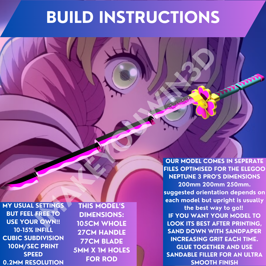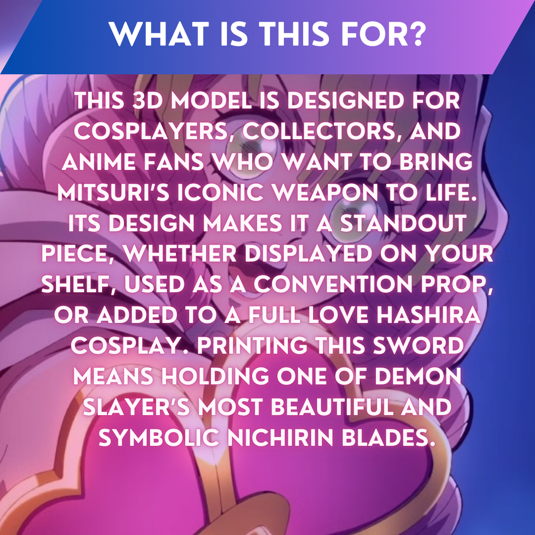 This 3D model is designed for cosplayers, collectors, and anime fans who want to bring Mitsuri’s iconic weapon to life. Its design makes it a standout piece, whether displayed on your shelf, used as a convention prop, or added to a full Love Hashira cosplay. Printing this sword means holding one of Demon Slayer’s most beautiful and symbolic Nichirin blades.