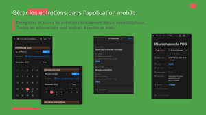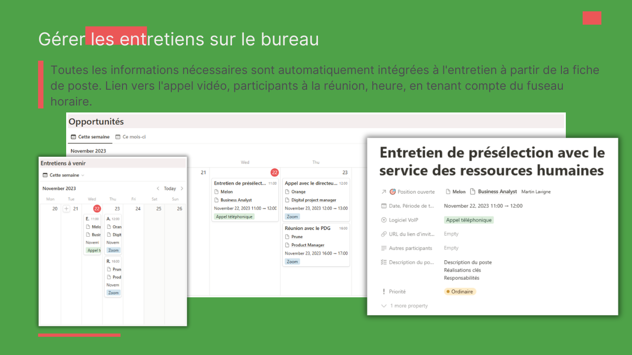 - Planifiez, suivez et gérez vos prochains entretiens à l'aide de vues calendaires spécialement conçues. Gardez une trace des dates d'entretien, des horaires (y compris les fuseaux horaires), des opportunités associées, et même des applications VoIP préférées pour la communication.
