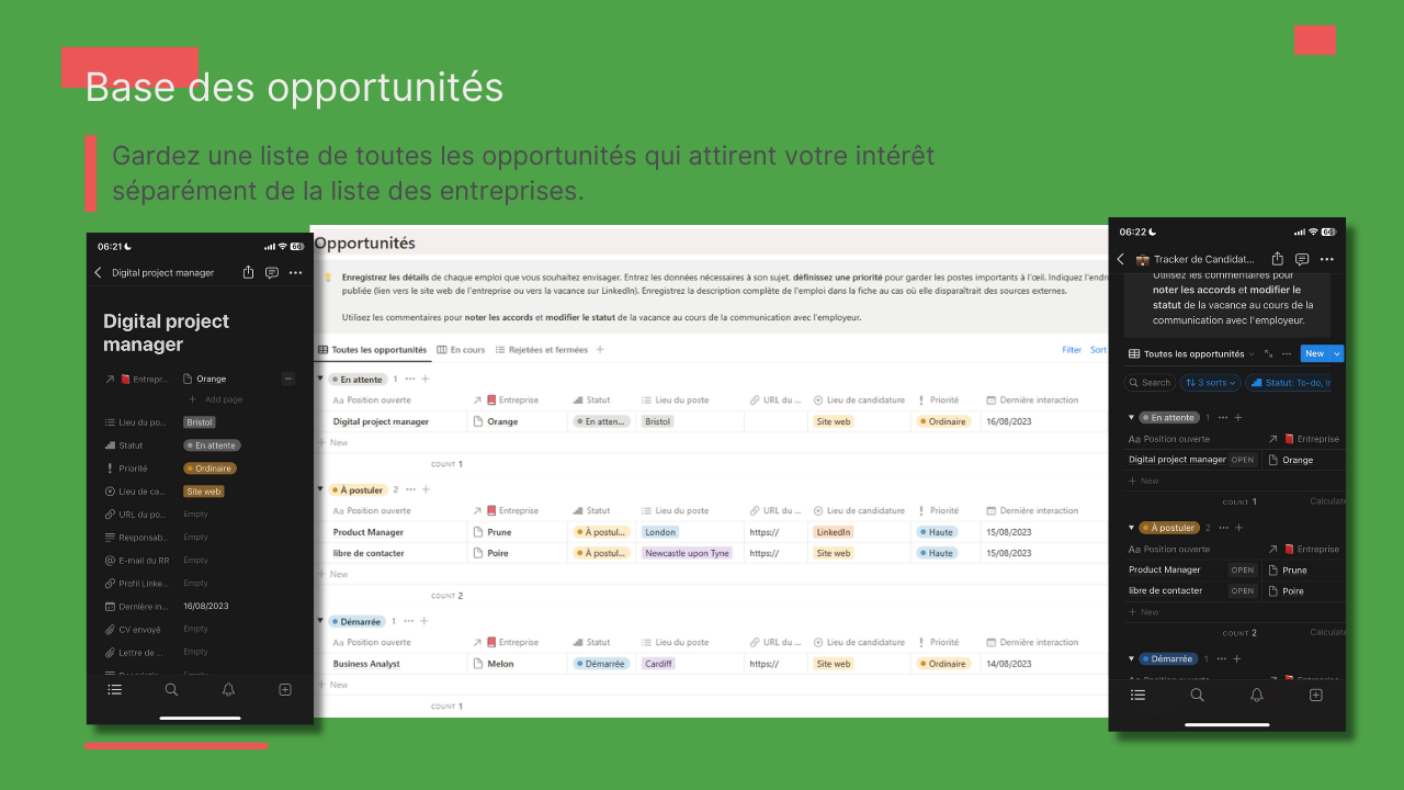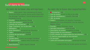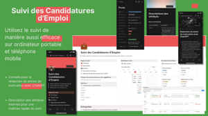 - Classez et regroupez efficacement les entreprises et les offres d'emploi en fonction de divers paramètres pour prioriser vos candidatures de manière efficace.