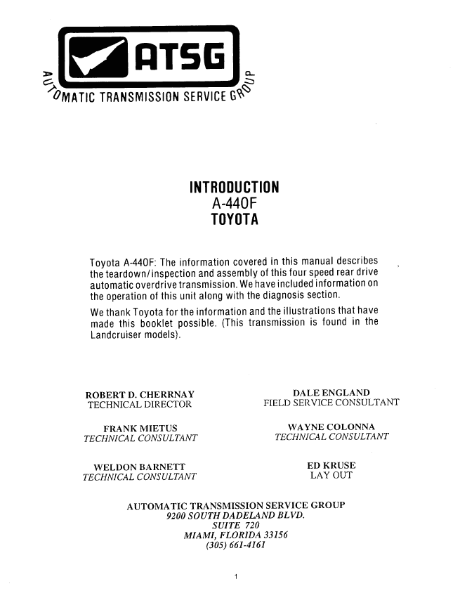 Toyota A440F – ATSG (Automatic Transmission Service Group) PDF. Toyota A-440F: The information covered in this manual describes the teardown/inspection and assembly of this four speed rear drive automatic overdrive transmission. We have included information on the operation of this unit along with the diagnosis section.