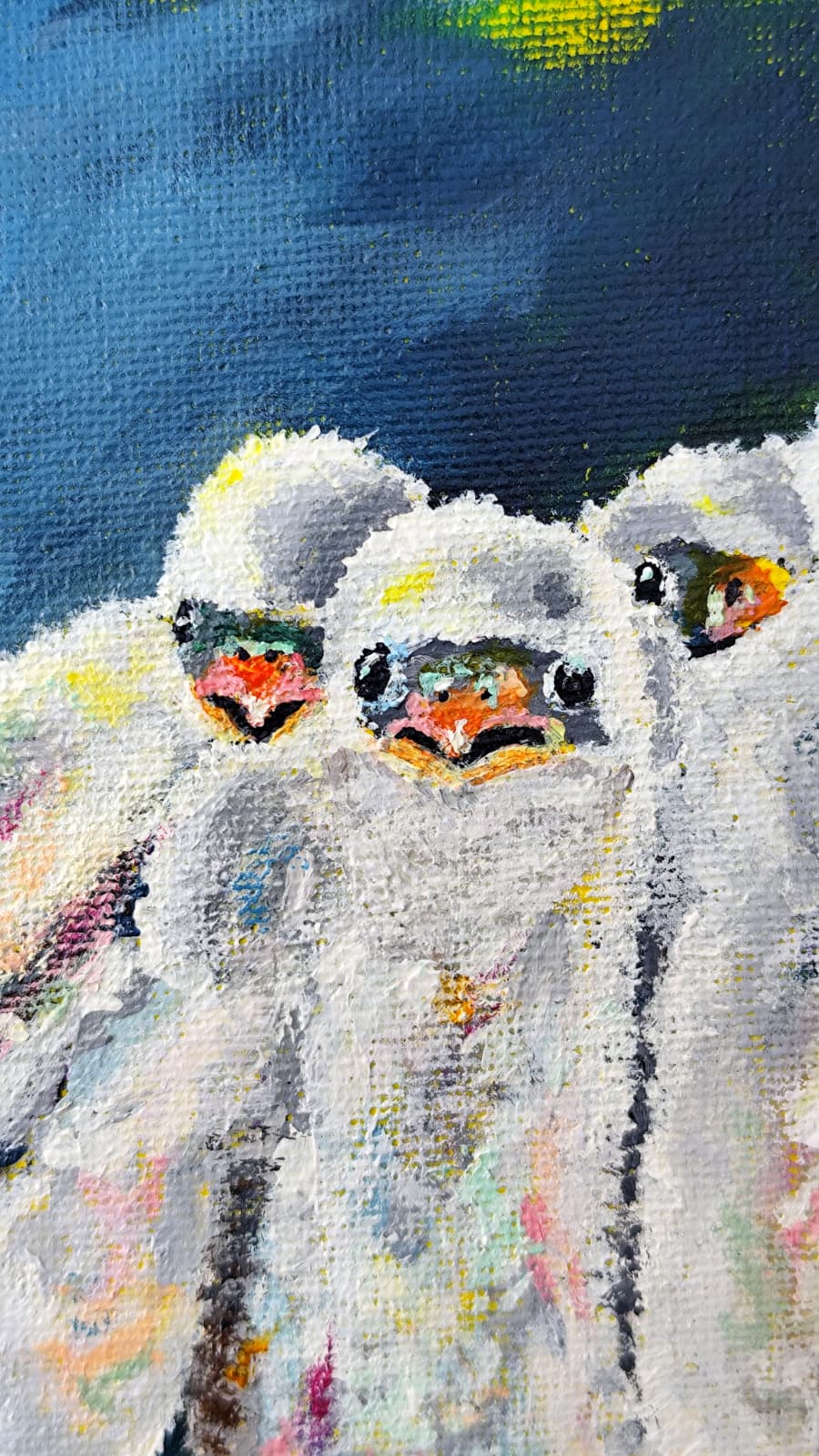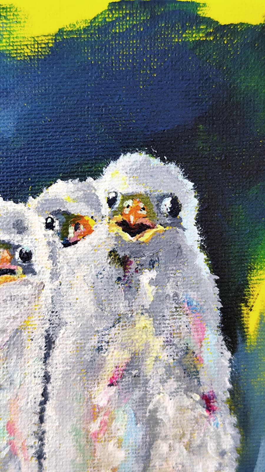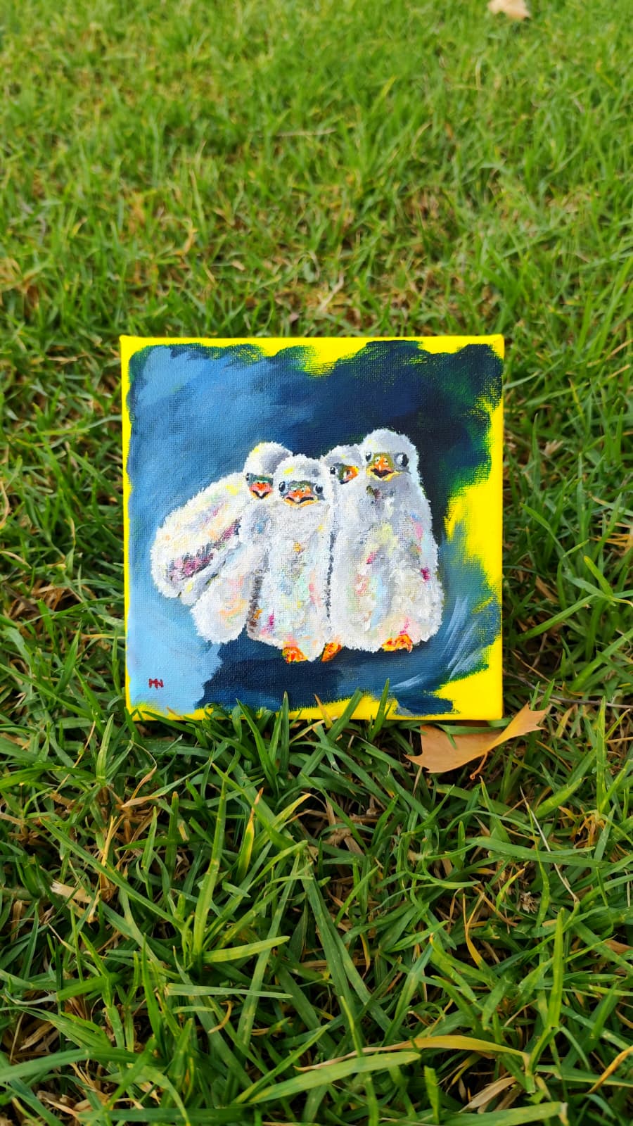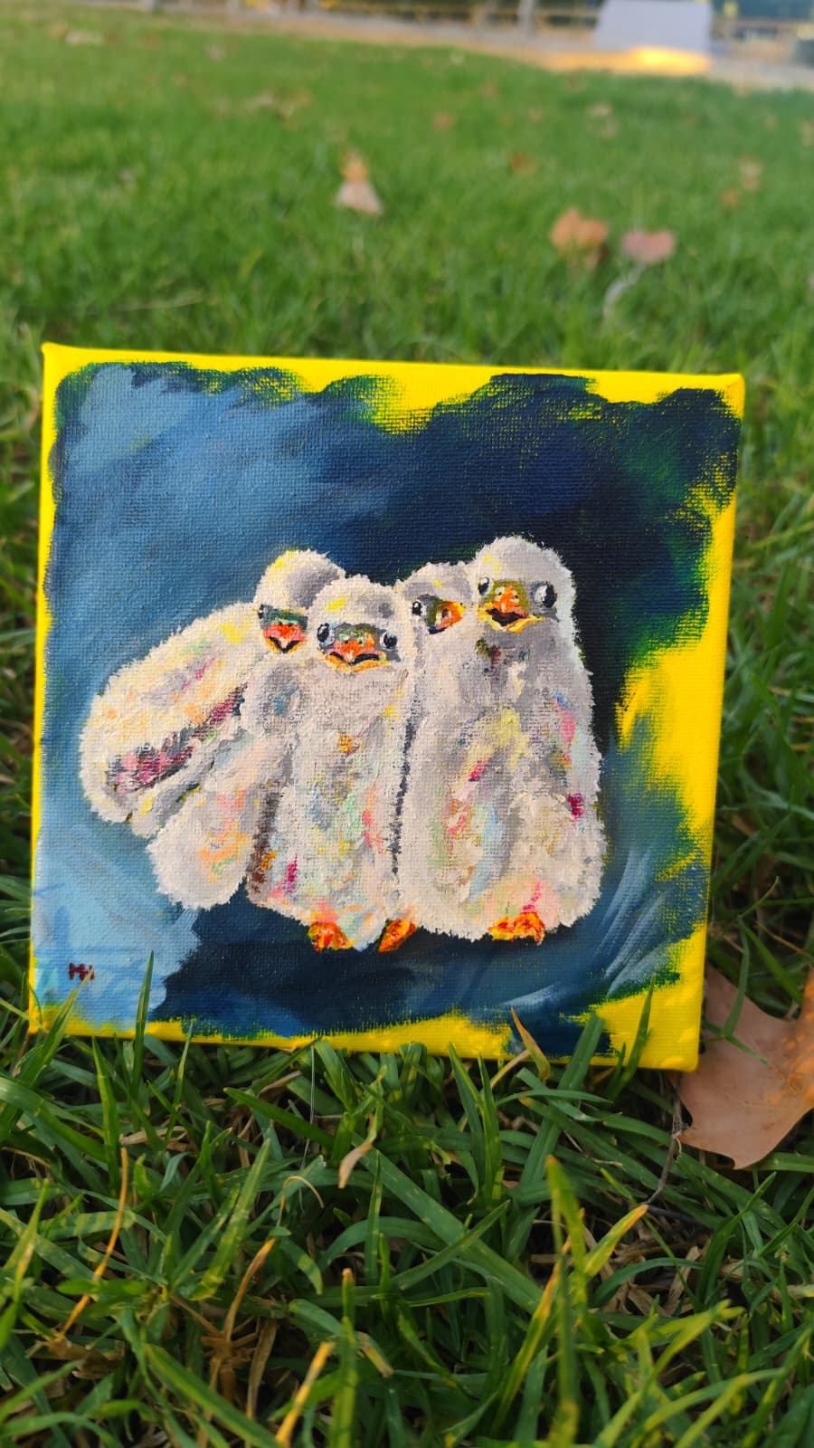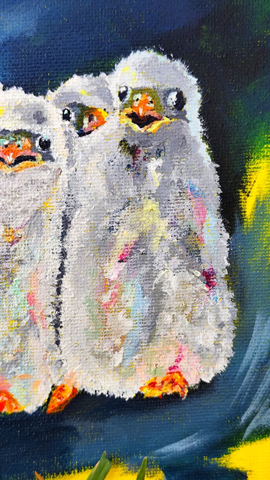 Este lienzo está inspirado en mi propia experiencia recogiendo polluelos de cernícalo primilla en cajas nido, tan necesarias hoy en día debido a la alarmante disminución de parejas en libertad. Quise ilustrar ese instante tan intenso: los pequeños, acurrucados en una esquina, con miedo y tratando de evitar a toda costa ser cogidos. A través de la pintura busco transmitir esa mezcla de ternura y fragilidad, así como la importancia de proteger a esta especie y el valor que tienen las cajas nido para su conservación.