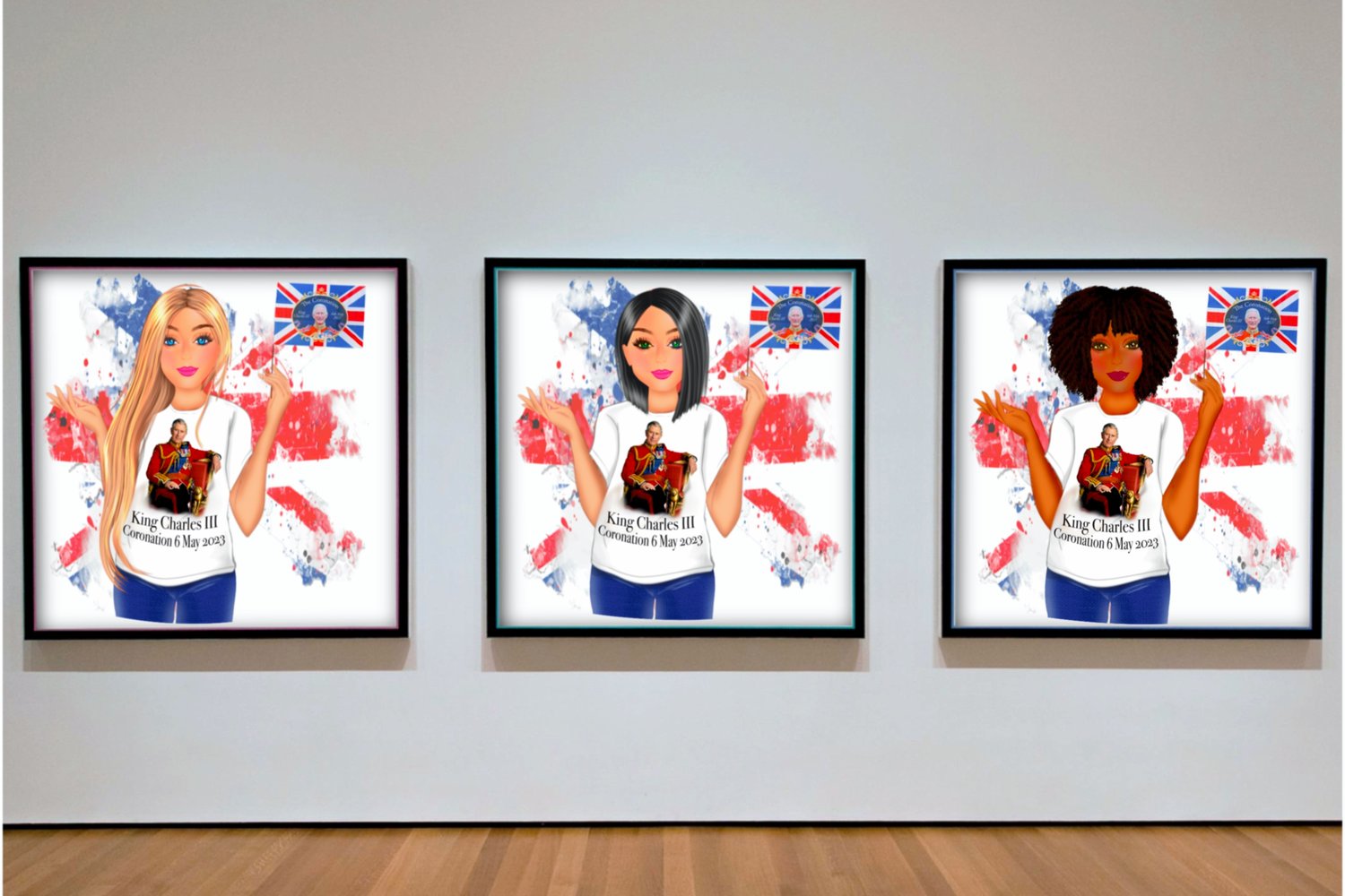 Coronation girls. 45 individual girls wearing coronation t shirts and waving the coronation flag on a Union Jack background.