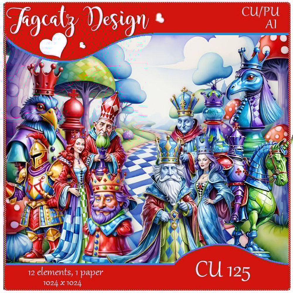 A full Wonderland style chess set, one red, one blue. 6 pieces in each color: King, Queen, Knight, Bishop, Rook, Pawn. AI generated. CU/PU pack saved at 300dpi. 1024 x 1024