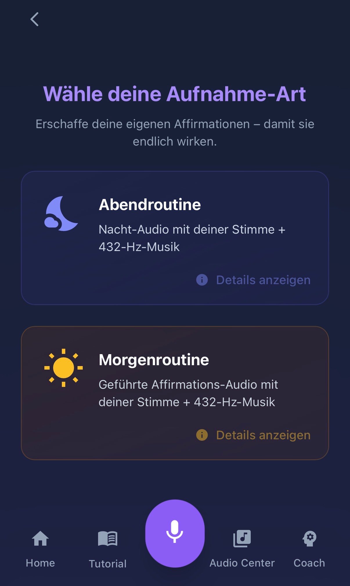 Sammle deine Affirmationen, gestalte sie individuell und verwandle sie in kraftvolle Audiodateien, die direkt auf dein Unterbewusstsein wirken. Mit klaren Schritt-für-Schritt-Anleitungen begleitet dich die App durch energiegeladene Morgenroutinen und entspannende Abendrituale.