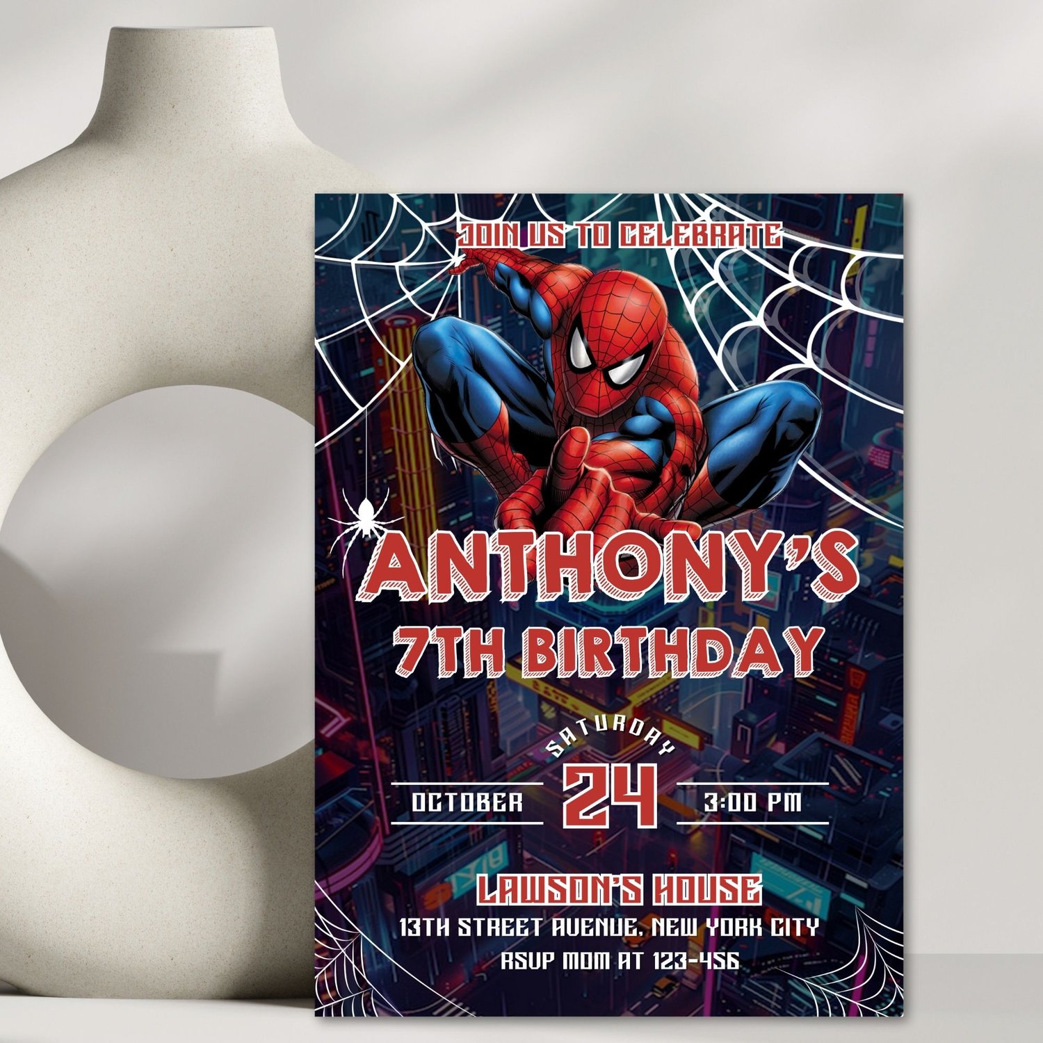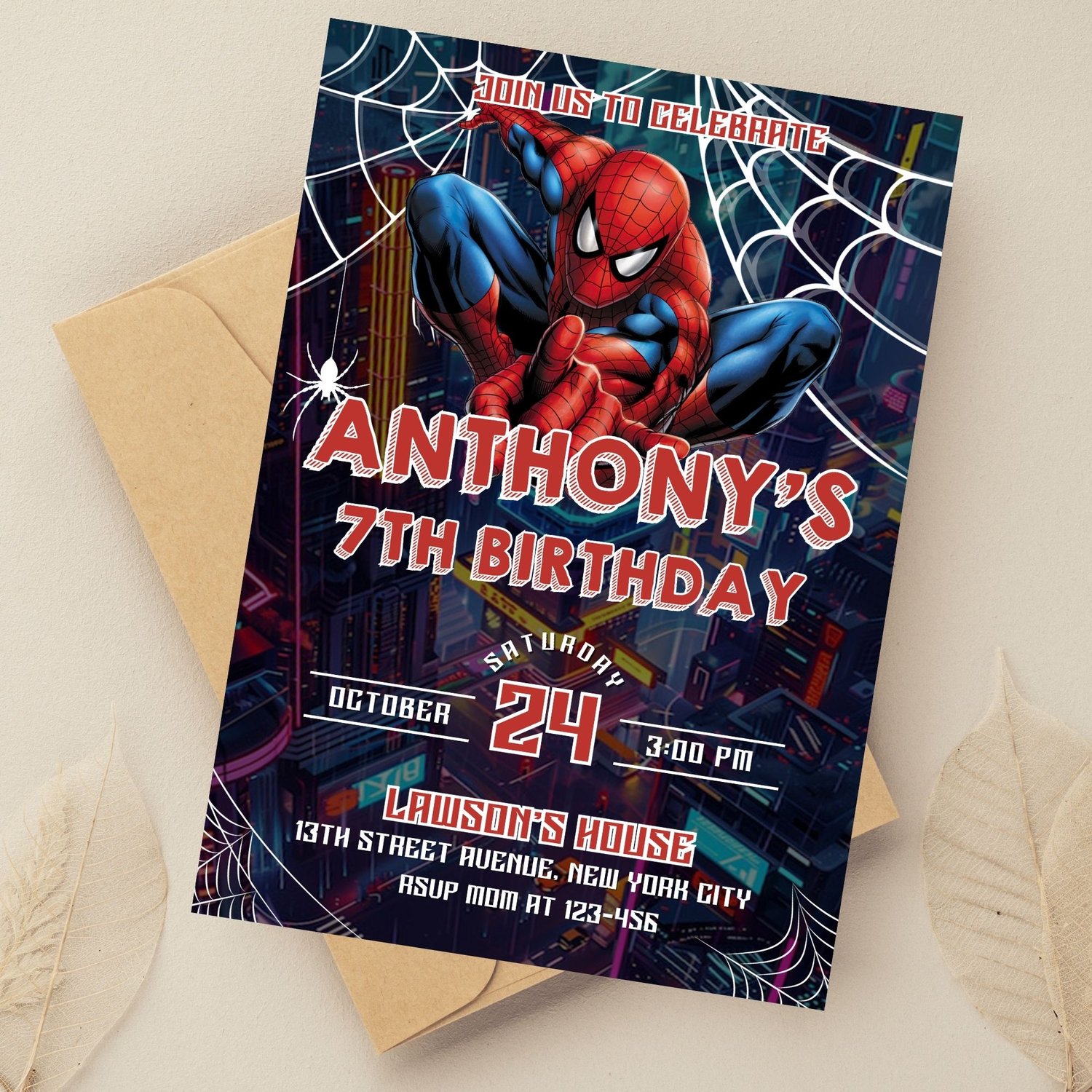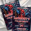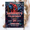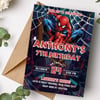 Editable Spider-Man birthday invitation template for kids. Instant digital download, fully customizable in Canva—perfect for superhero birthday parties.