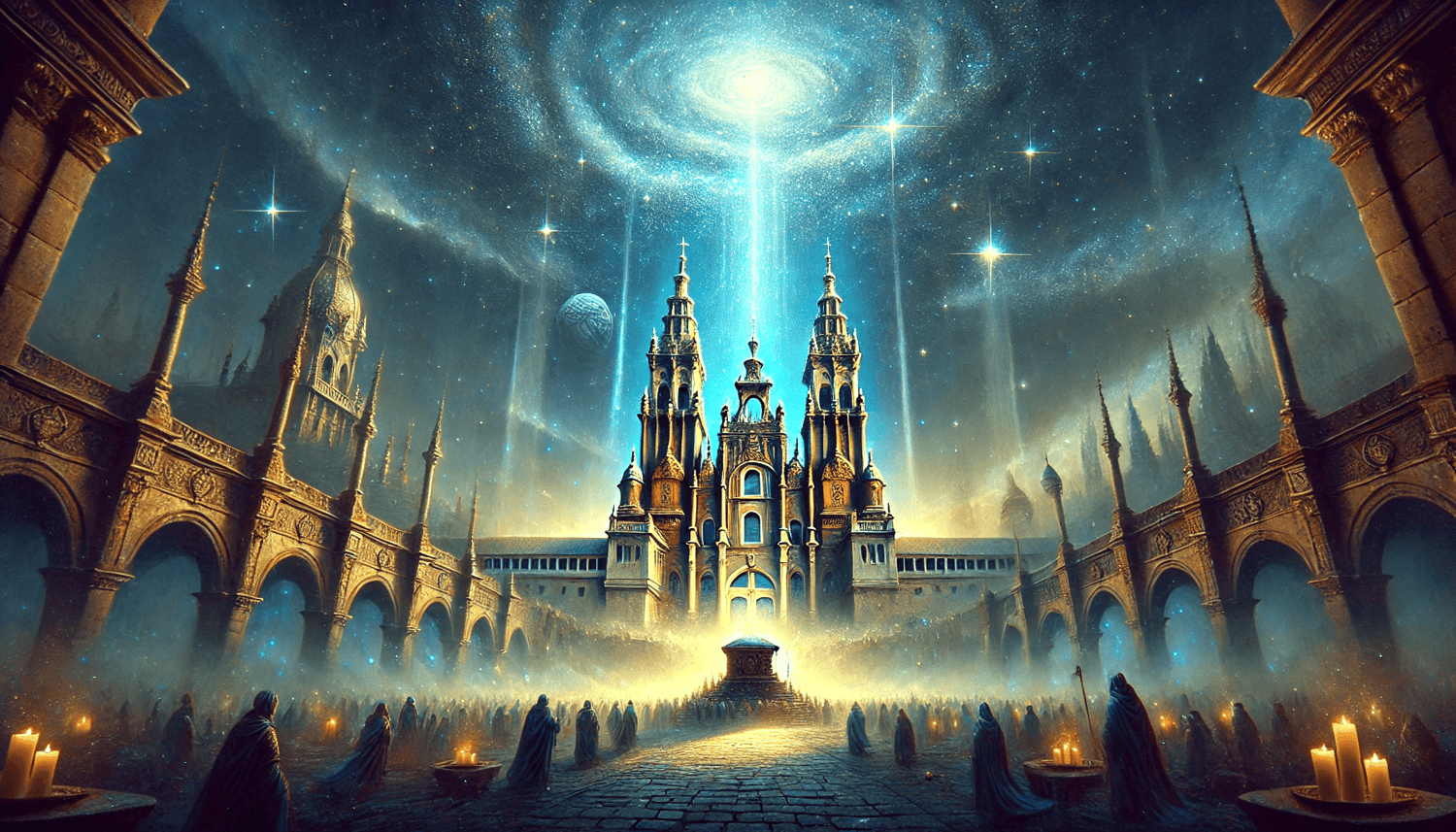 A mystical and ethereal tribute to the sacred journey of the Camino de Santiago, this breathtaking digital artwork captures the symbolic and spiritual essence of Santiago de Compostela. Pilgrims, bathed in candlelight, stand in awe before the radiant Catedral de Santiago, which rises like a celestial gateway beneath a cosmic sky.
