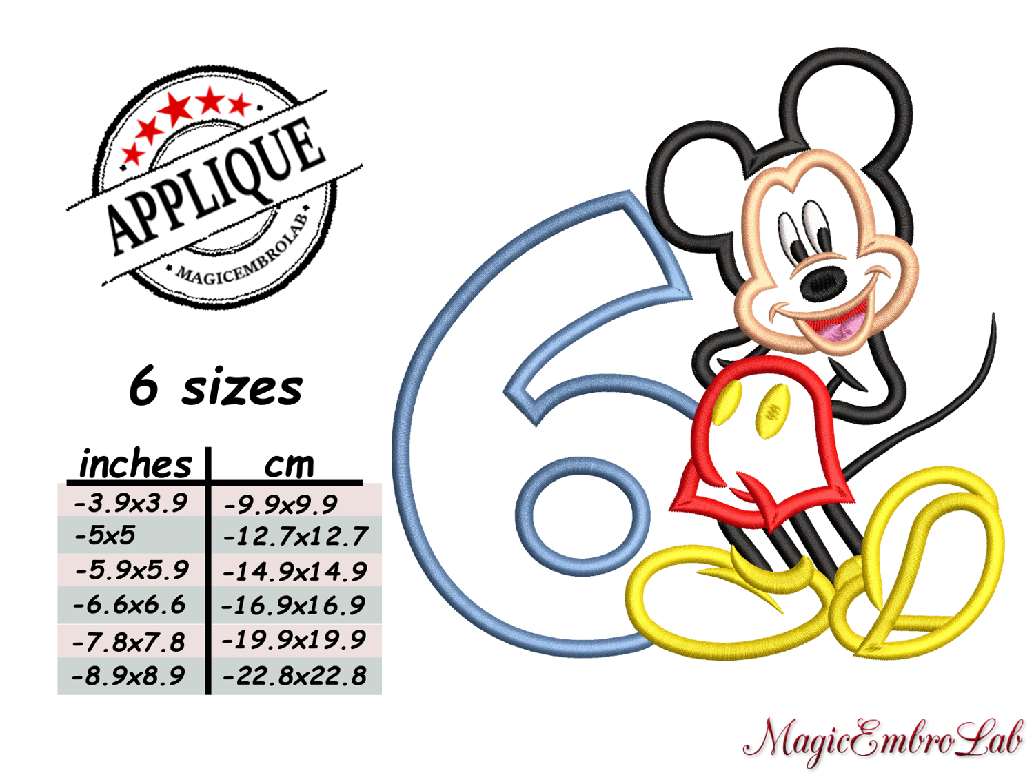 Mickey Mouse APPLIQUE Design, Sixth Birthday, 6 sizes, Instant Download