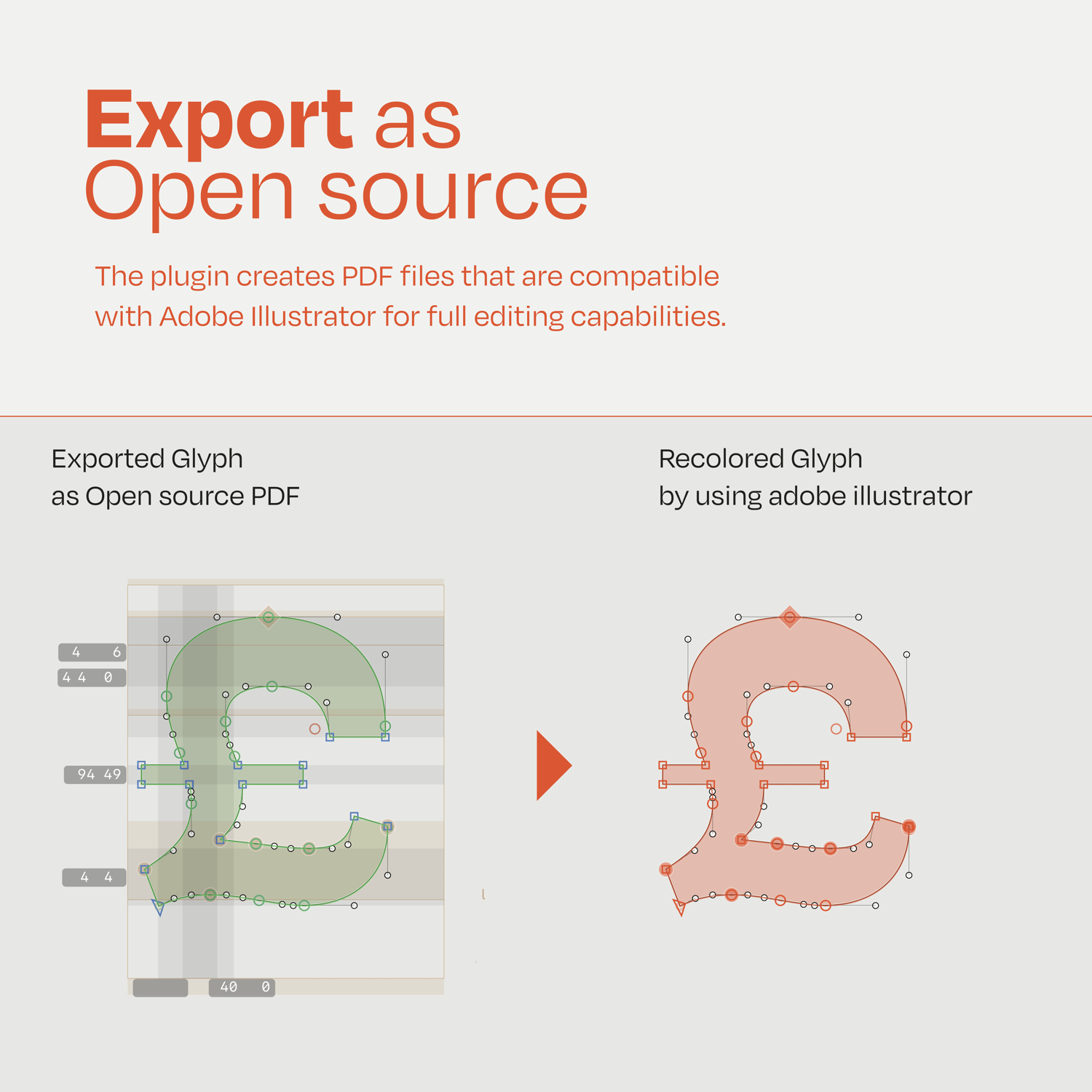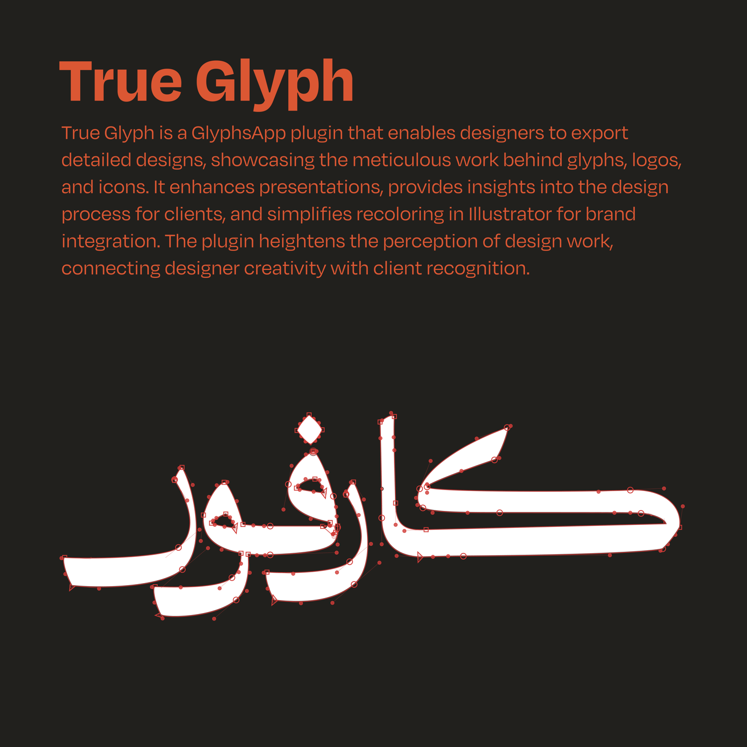 True Glyph is a GlyphsApp plugin that enables designers to export detailed designs, showcasing the meticulous work behind glyphs, logos, and icons. It enhances presentations, provides insights into the design process for clients, and simplifies recoloring in Illustrator for brand integration. The plugin heightens the perception of design work, connecting designer creativity with client recognition.