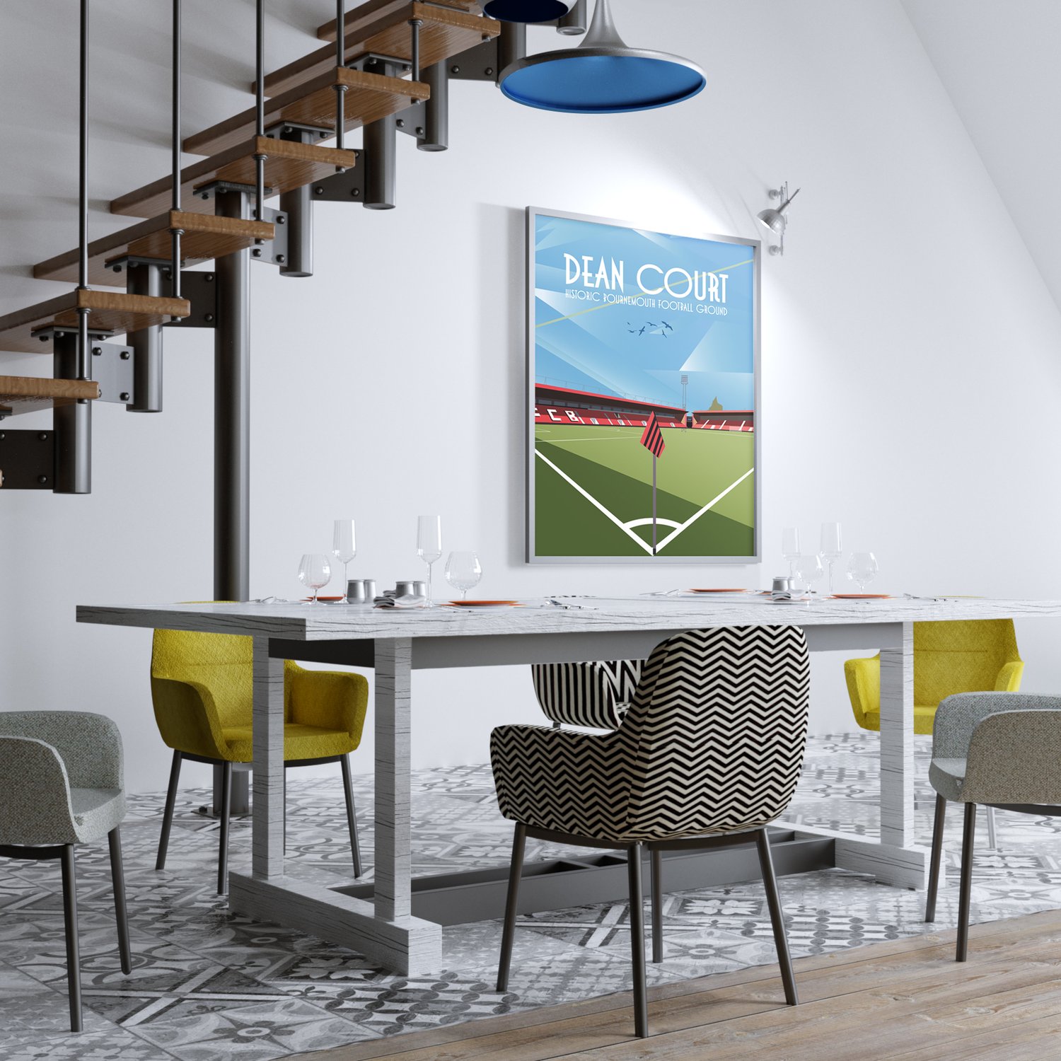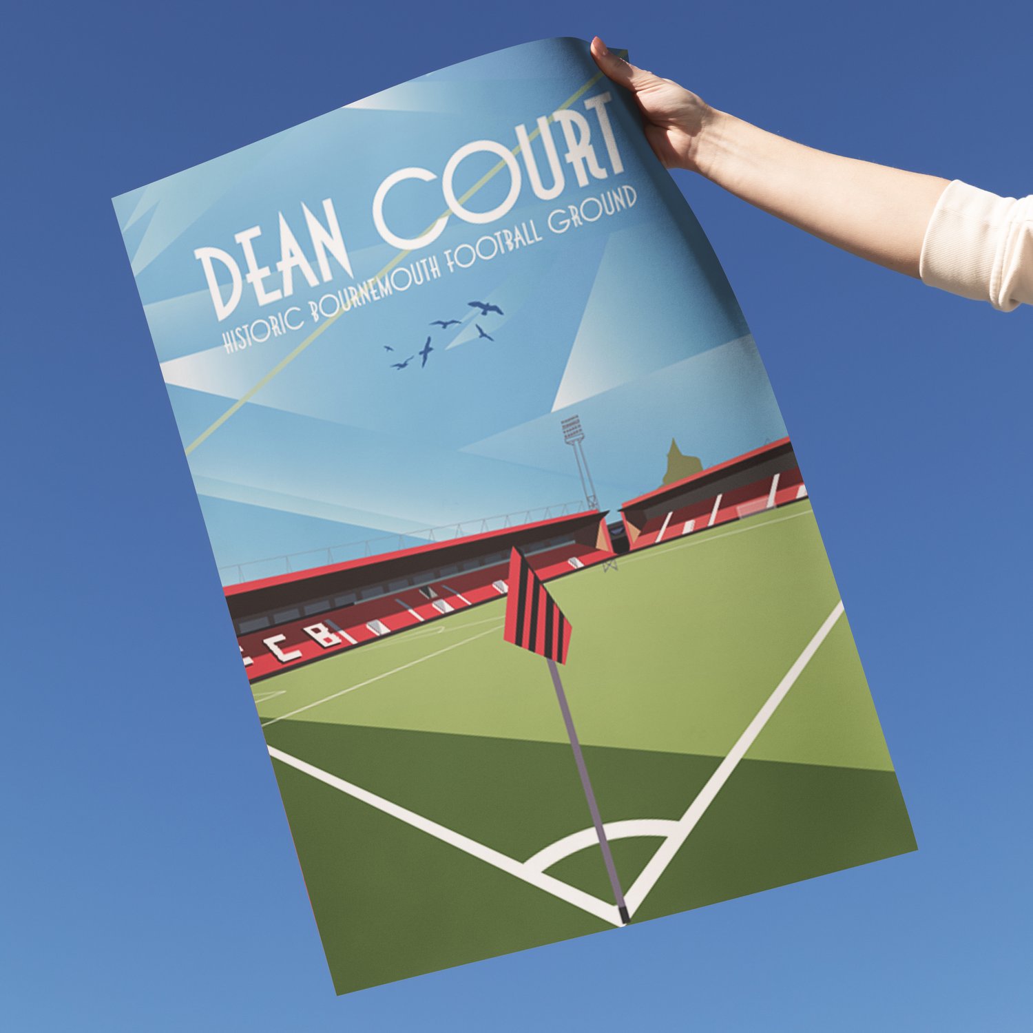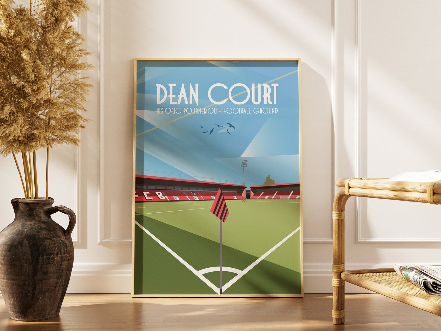 ✨ WHY YOU'LL LOVE IT ULTRA-VIBRANT ART: Expertly illustrated to highlight Dean Court's vibrant red and black striped corner flag, floodlight tower, and sunny seaside sky — a spirited tribute to one of the South Coast's most beloved football clubs.