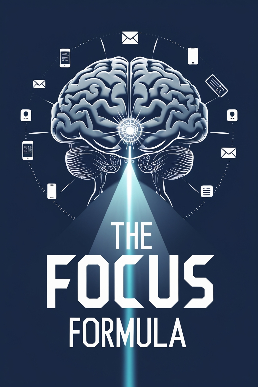 In the background, grayed-out distraction icons like phones and emails gradually fade into the dark blue canvas, showing the elimination of noise and clutter. The title, “The Focus Formula”, stands bold in a tech-inspired futuristic font, reinforcing the book’s theme of cutting-edge mental mastery.