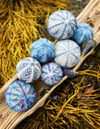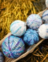 I made mine in fingering, sport, dk, and worsted-weight yarns to cover balls between 2.5 and 4 inches in diameter, but you can make them in any weight of yarn, and the finished size will change depending on what yarn you use. You don’t need to match any particular gauge, but you do need to knit tightly enough to make a firm fabric so your stitching doesn’t show through the fabric. I'll have you check your knitting against your innards early on, so you don't need to stress over gauge.