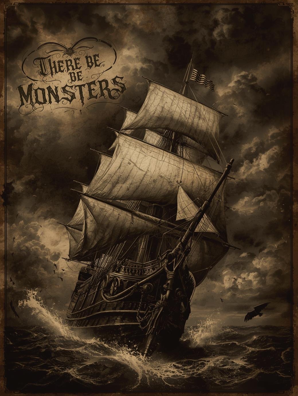 Majestatyczny żaglowiec sunący po otwartym morzu, osadzony na tle antycznej mapy, oddaje ducha podróży, wolności i odwagi.