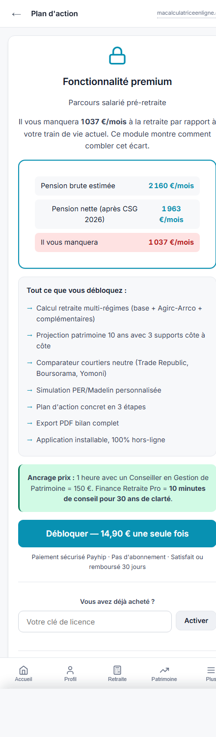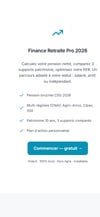 Finance Retraite Pro 2026 — Simulateur retraite + patrimoine 10 ans + PER Madelin