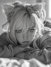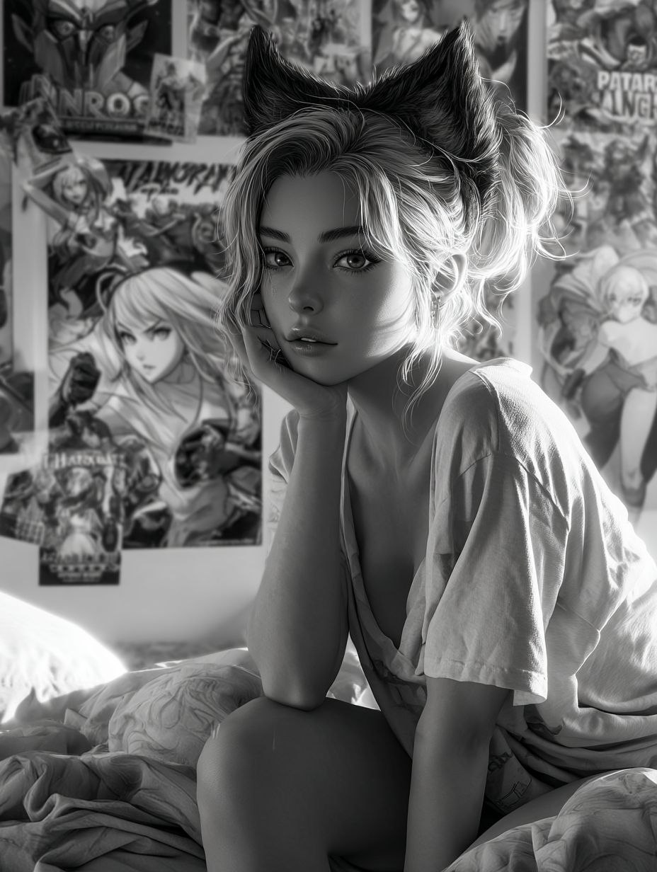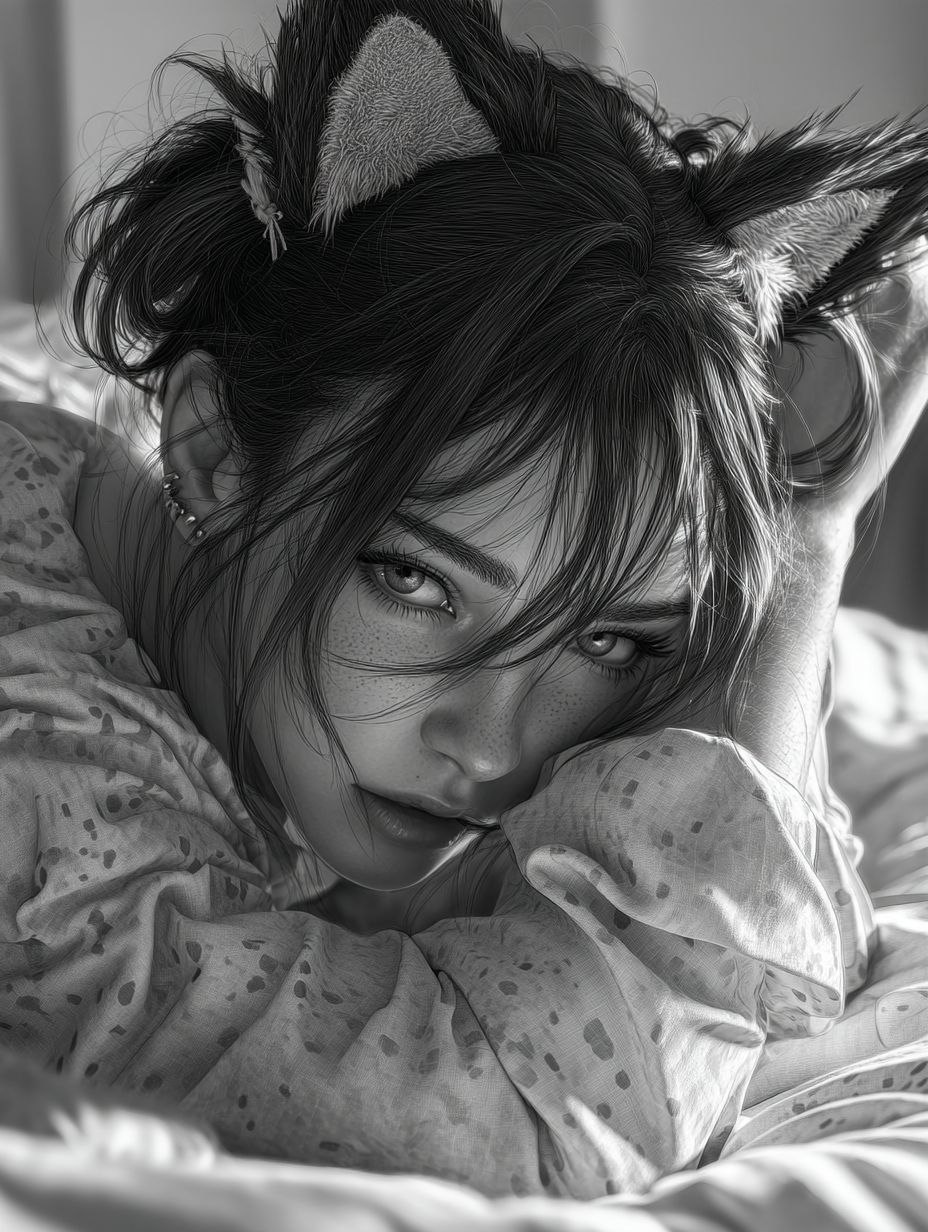 Generate a stunning 3D anime portrait of a cute girl with cat ears, collapsed on a bed in a men’s shirt. Perfect for avatar creators, digital artists, and fantasy art enthusiasts, this prompt delivers highly detailed facial features, expressive eyes, and beautiful anime-style body rendering, inspired by Artgerm and William Bugero. Trending style for CGSociety-level fantasy and 3D anime art, ideal for character design, social media avatars, or collectible illustrations. Keywords: 3D anime girl, fantasy portrait, black & white, detailed anime, CGSociety trending, cute avatar, Artgerm style, William Bugero.