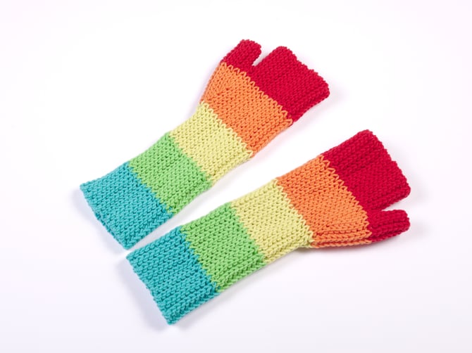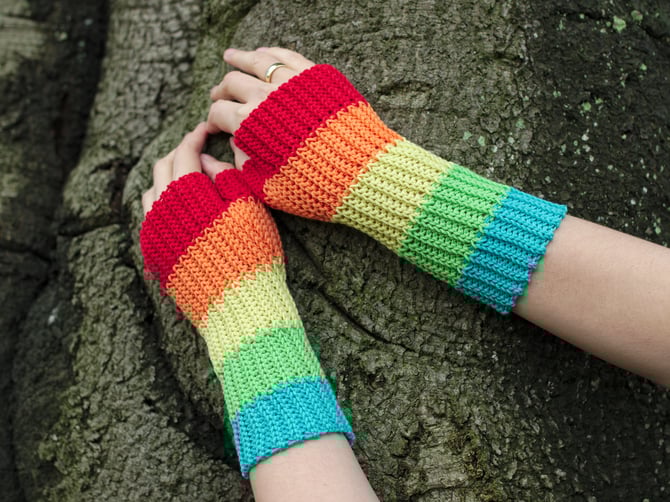Die Pulswärmer sind aus hinten eingestochenen Kettmaschen gehäkelt, was sie besonders elastisch macht. Sie sind schön lang und haben einen Daumenansatz, ideal für windiges Wetter.