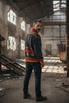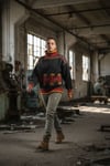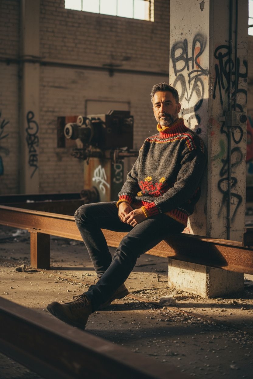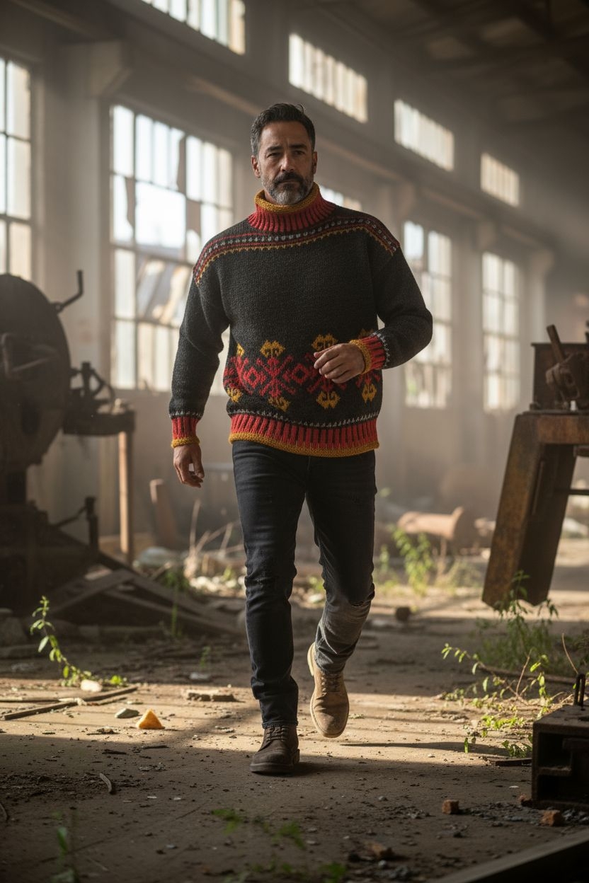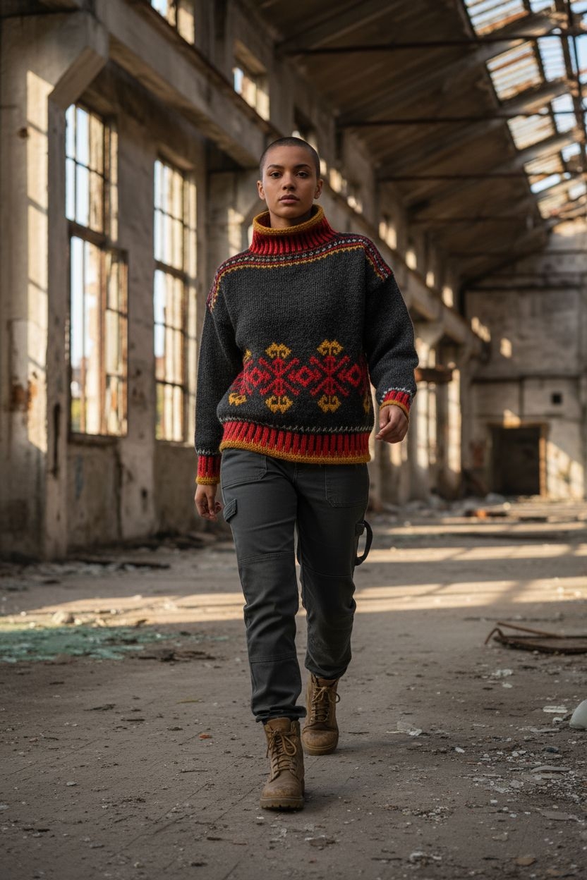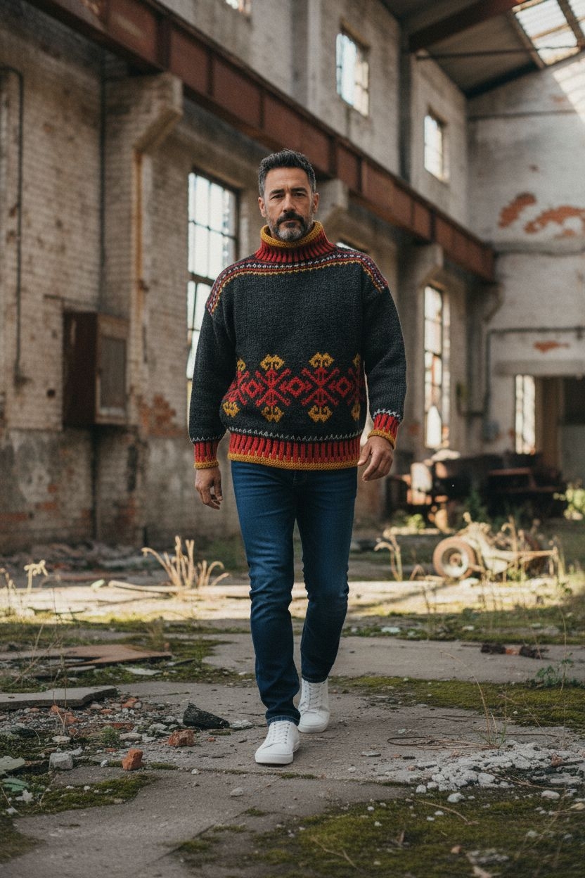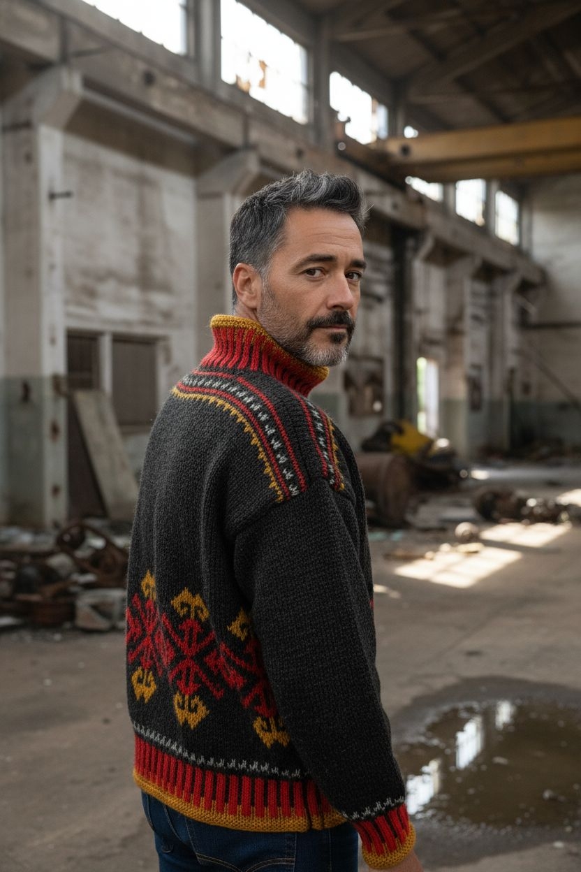 Raw, bold and deeply human — this handknitted folk-inspired pullover carries the soul of traditional craft into a thoroughly modern wardrobe. A dramatic charcoal base blazes to life with geometric ethnic motifs in fiery red and golden mustard, framed by a vivid striped turtleneck and contrast ribbed hem and cuffs.