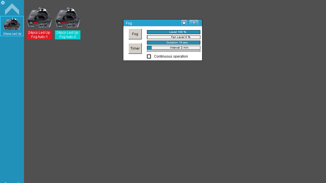 Con el Botón de “Fog” disparan humo mientras que esté presionado el botón. Al soltar apaga. Si activan el box de “Continuos Operation” queda apretado el botón por lo que largará humo hasta que lo vuelvan a presionar.