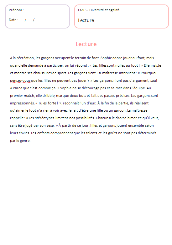 - EMC (Cycle 2) : respect d’autrui, égalité, coopération