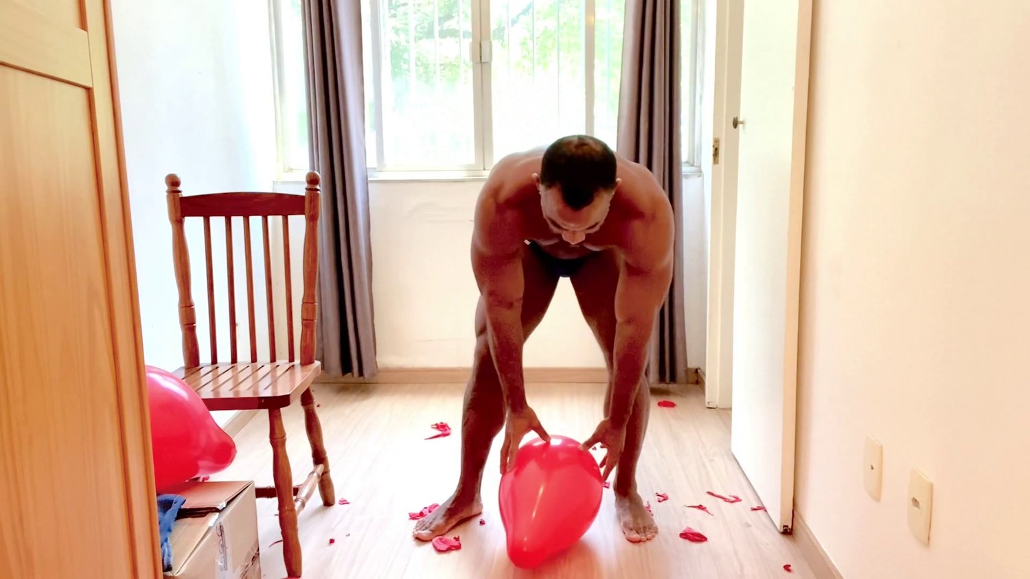 Brazilian beauty Ignacio is back this time with 12 inches balloons. He sits and stomps all of them while you enjoy his amazing body. This video runs for more than 7 minutes.