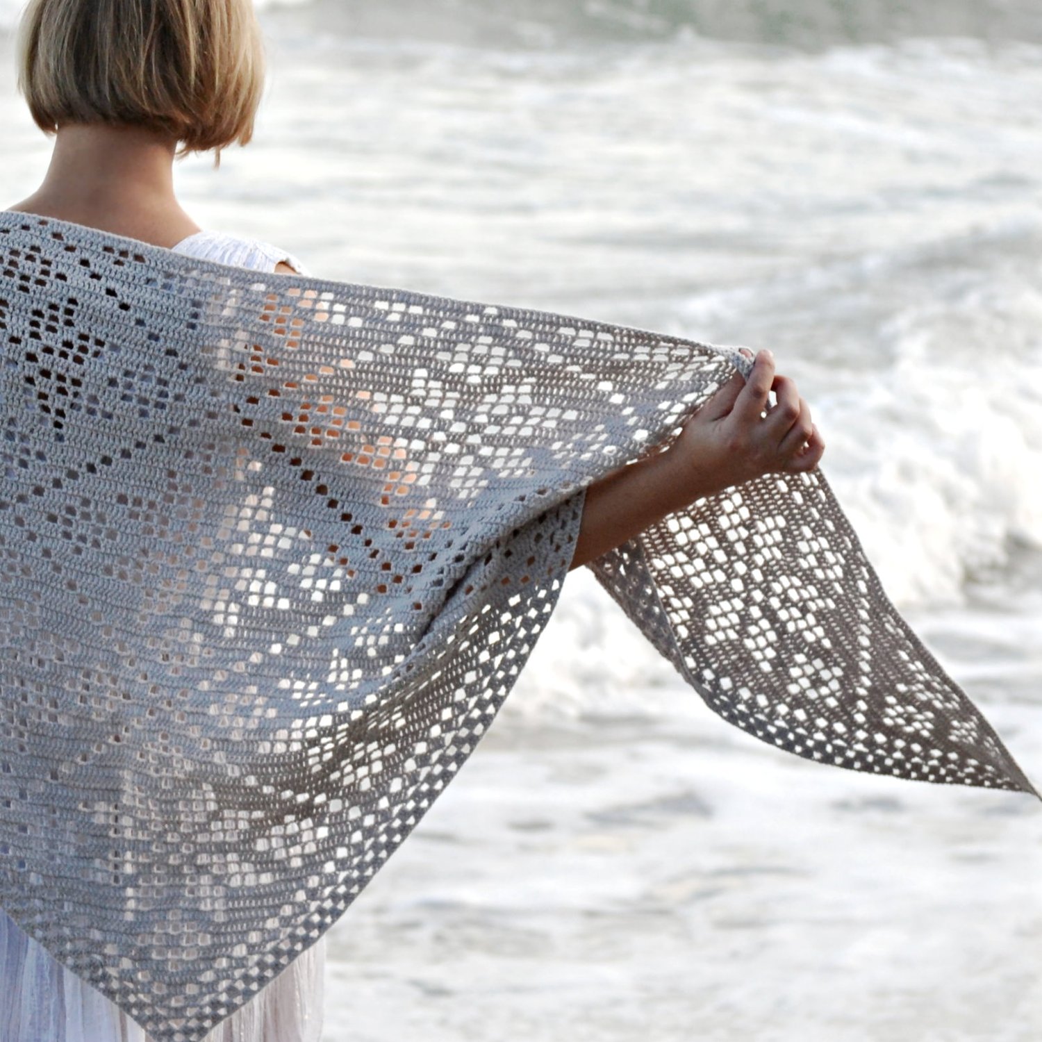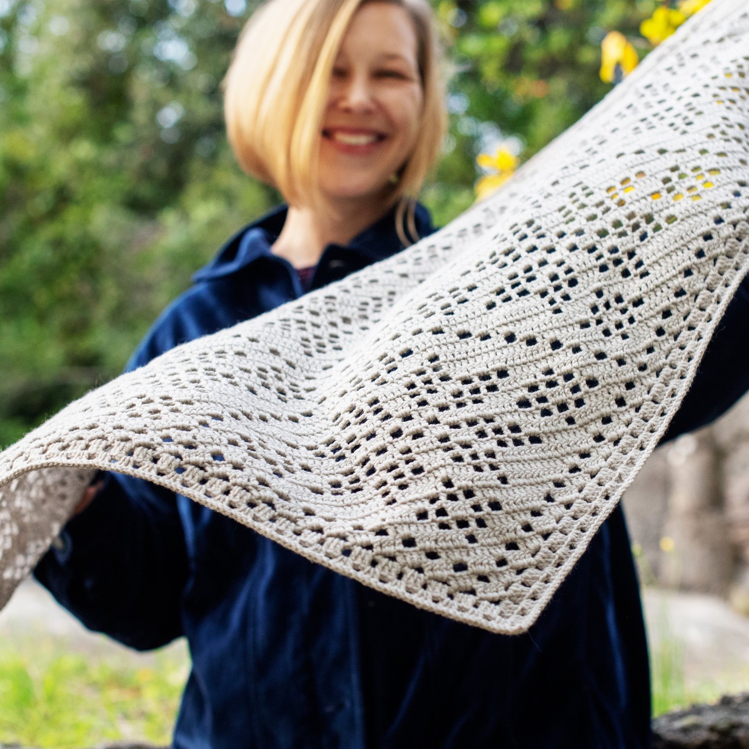Zirka is a modern triangular shawl worked from the bottom up in an airy, geometric filet crochet pattern. The name Zirka means star in Ukrainian — a fitting match for its timeless, radiating motif that echoes the shape of a star or snowflake.