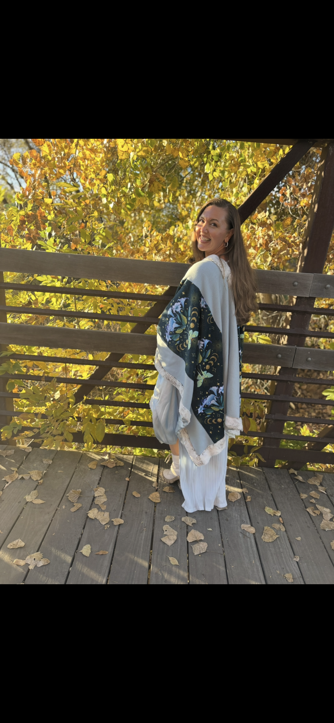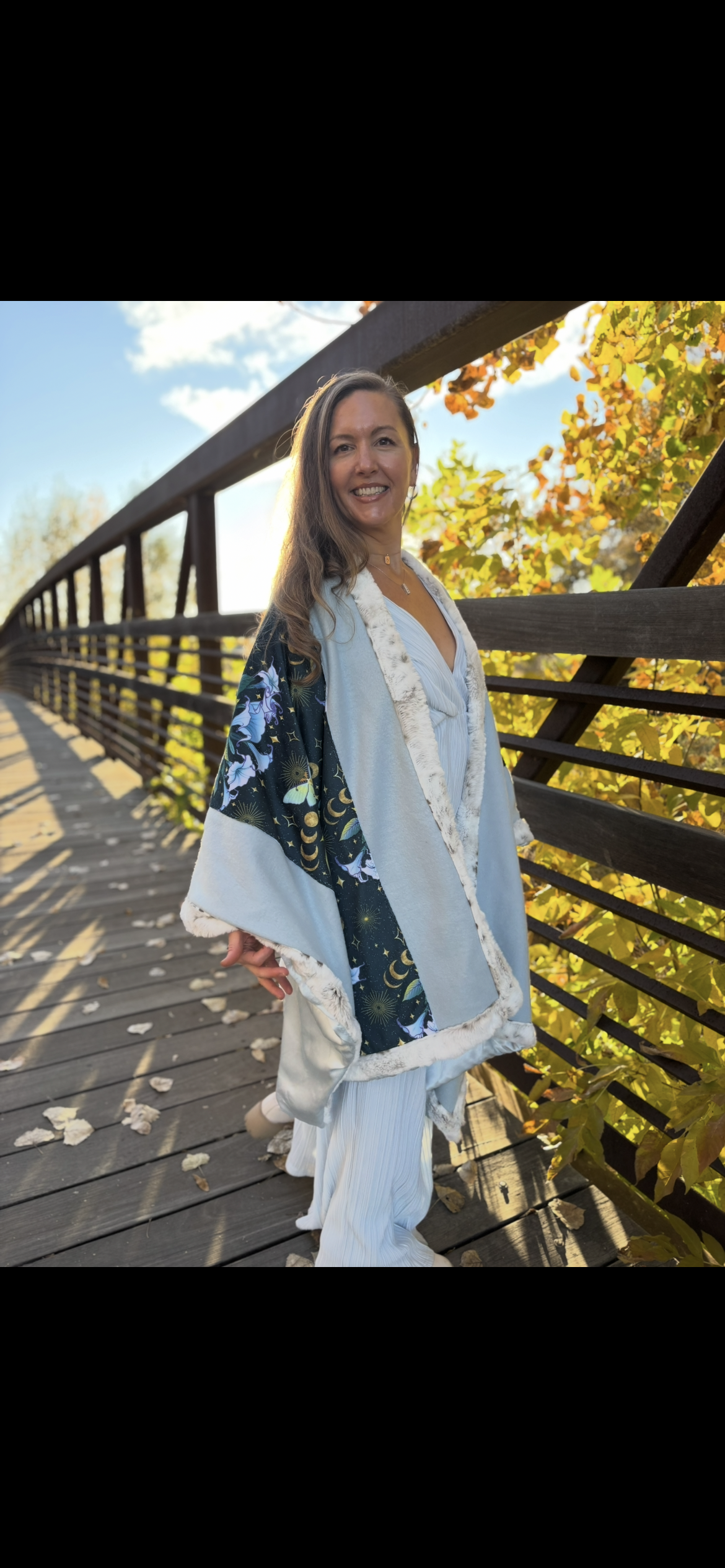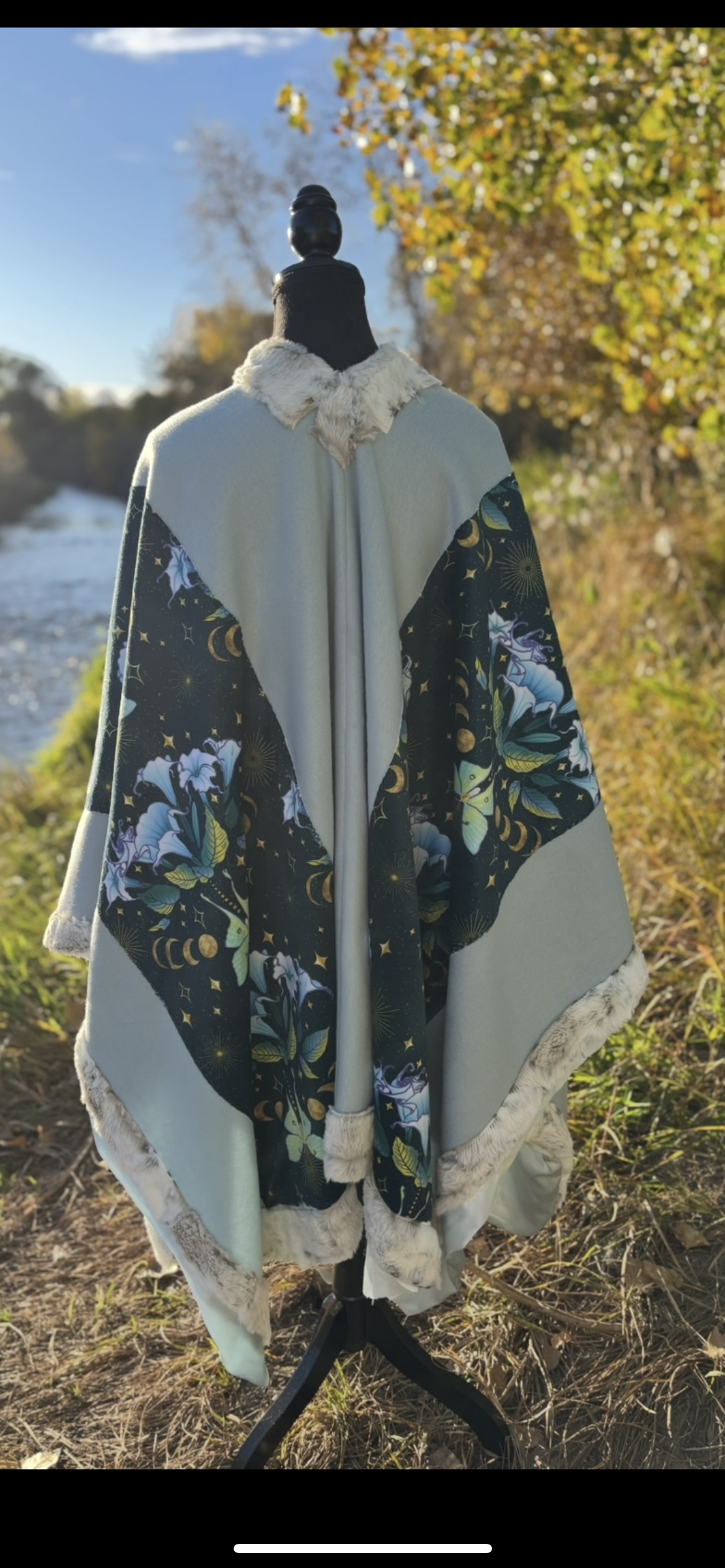 Soft, warm and beautiful open Poncho, fully lined. Made with Fleece, Minky velvet, Sustainable Satin and Faux Fur.