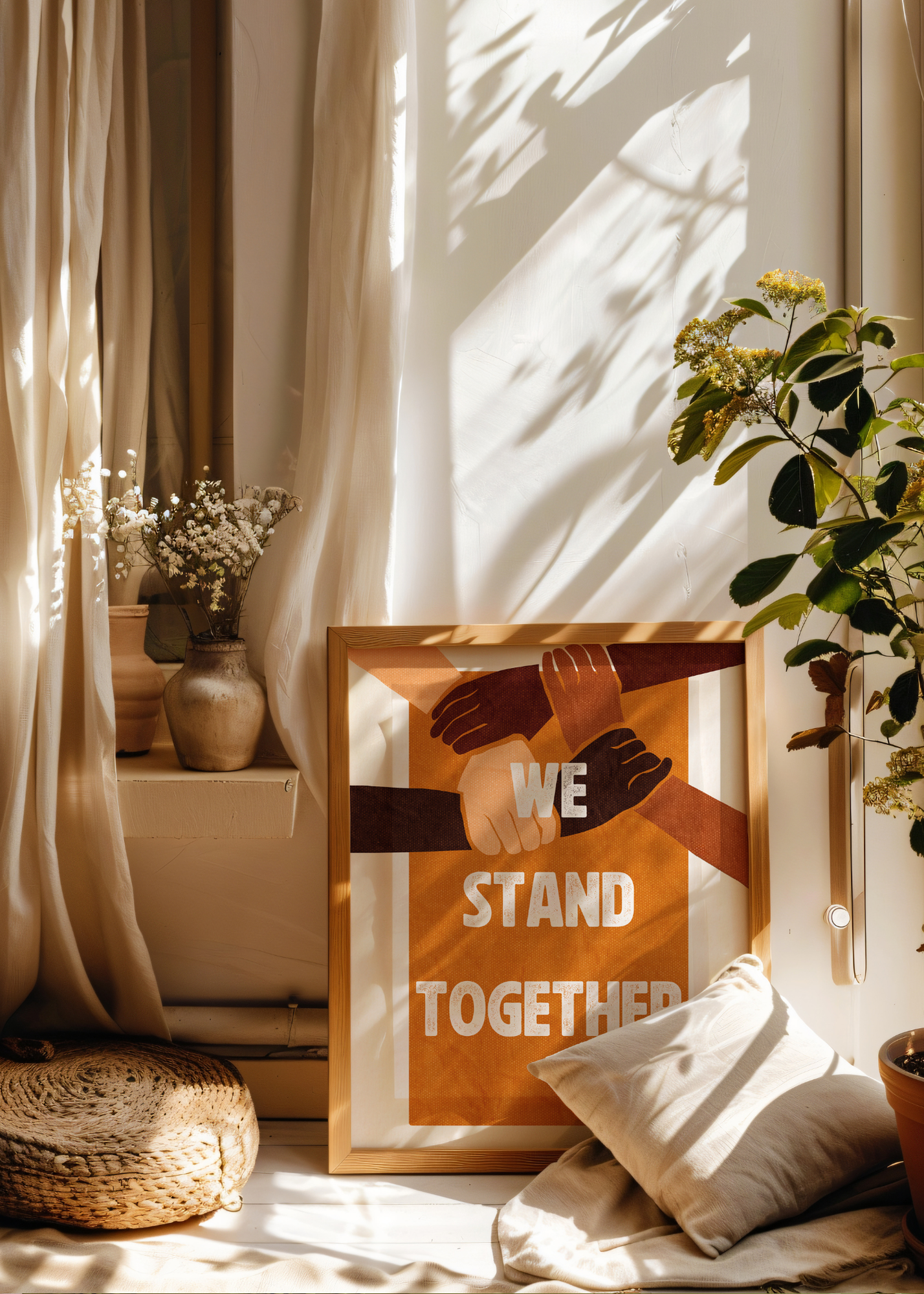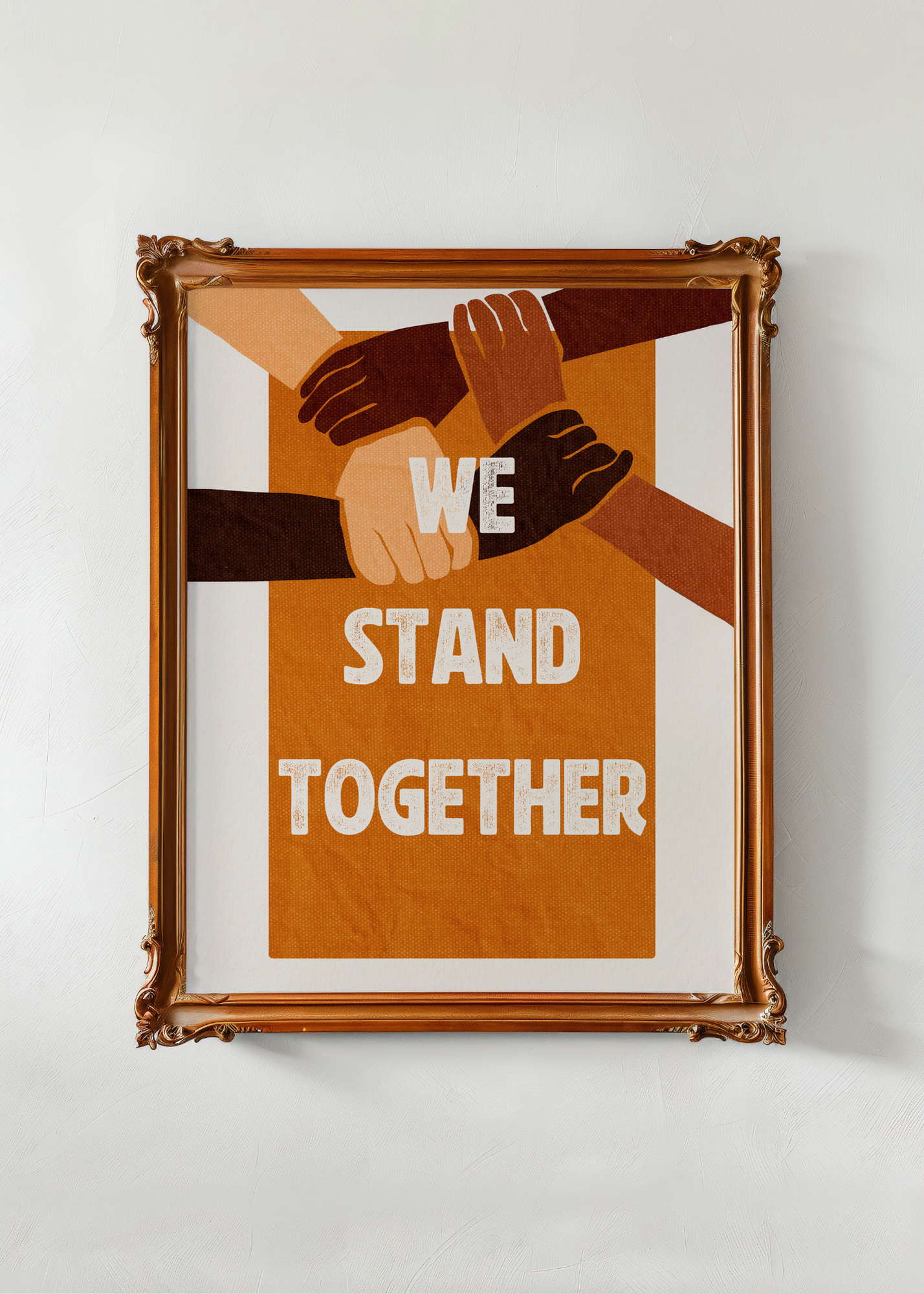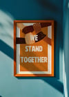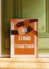 Stand Together— On an earthy brown background, this powerful print features illustrated arms and hands linked together in unity and strength. With bold white lettering declaring "We stand together," it’s a tribute to solidarity, community, and collective care.