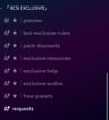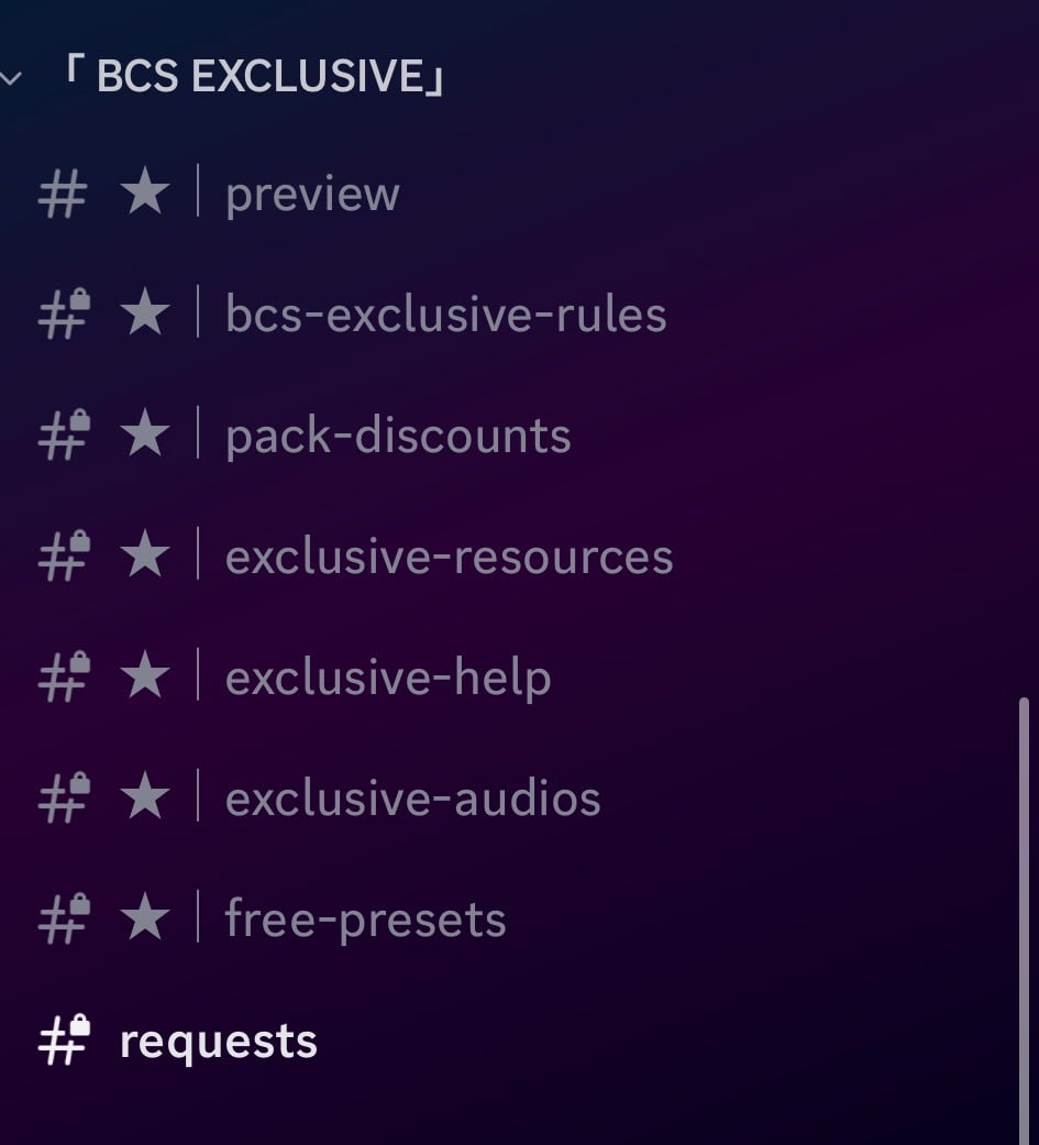 bcs exclusive refers to my discord server. As shown above in the pictures, you can request items and you will receive them, you cannot request whole packs. You can request tutorials on anything you may need, and you will receive extra help from me. Alongside with that, you can get pack discounts, free presets. And the audios I used to make in my edits. MORE TO COME!