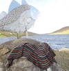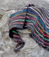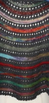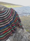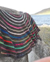 This is a shawl originally designed for using up sock yarn leftovers. It’s a quick and easy knit using Knit, Purl and Yarn Overs to create the pattern, and an optional picot cast off which combines casting on and off to create a pretty edge.The finished shawl is crescent shaped so will wrap around your shoulders in a hug and it tends to stay put without a shawl pin. It will also hang nicely at the front if you prefer.
