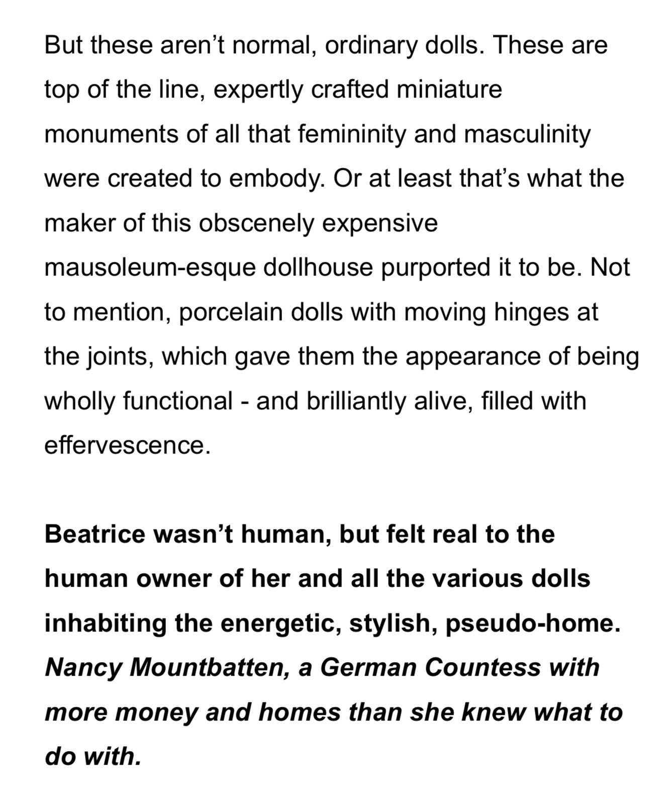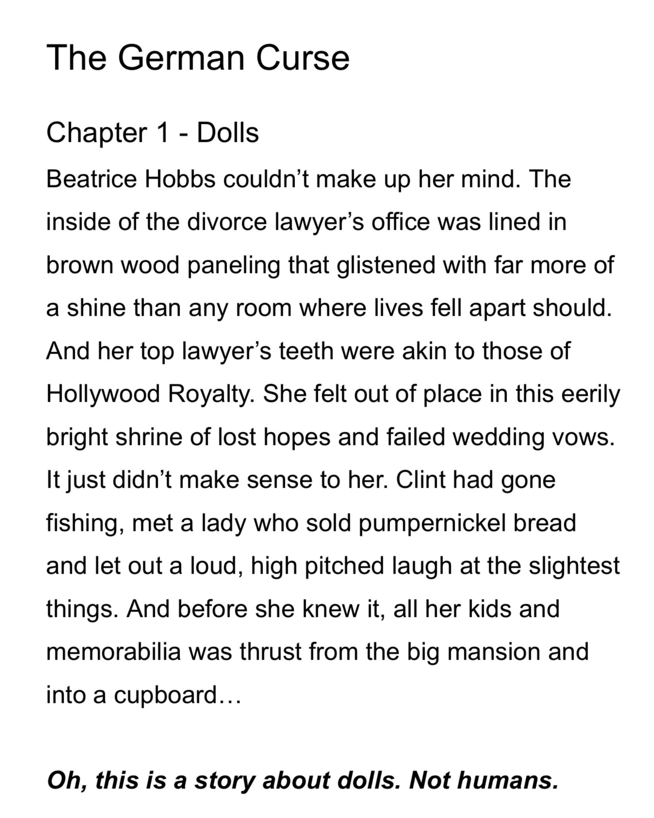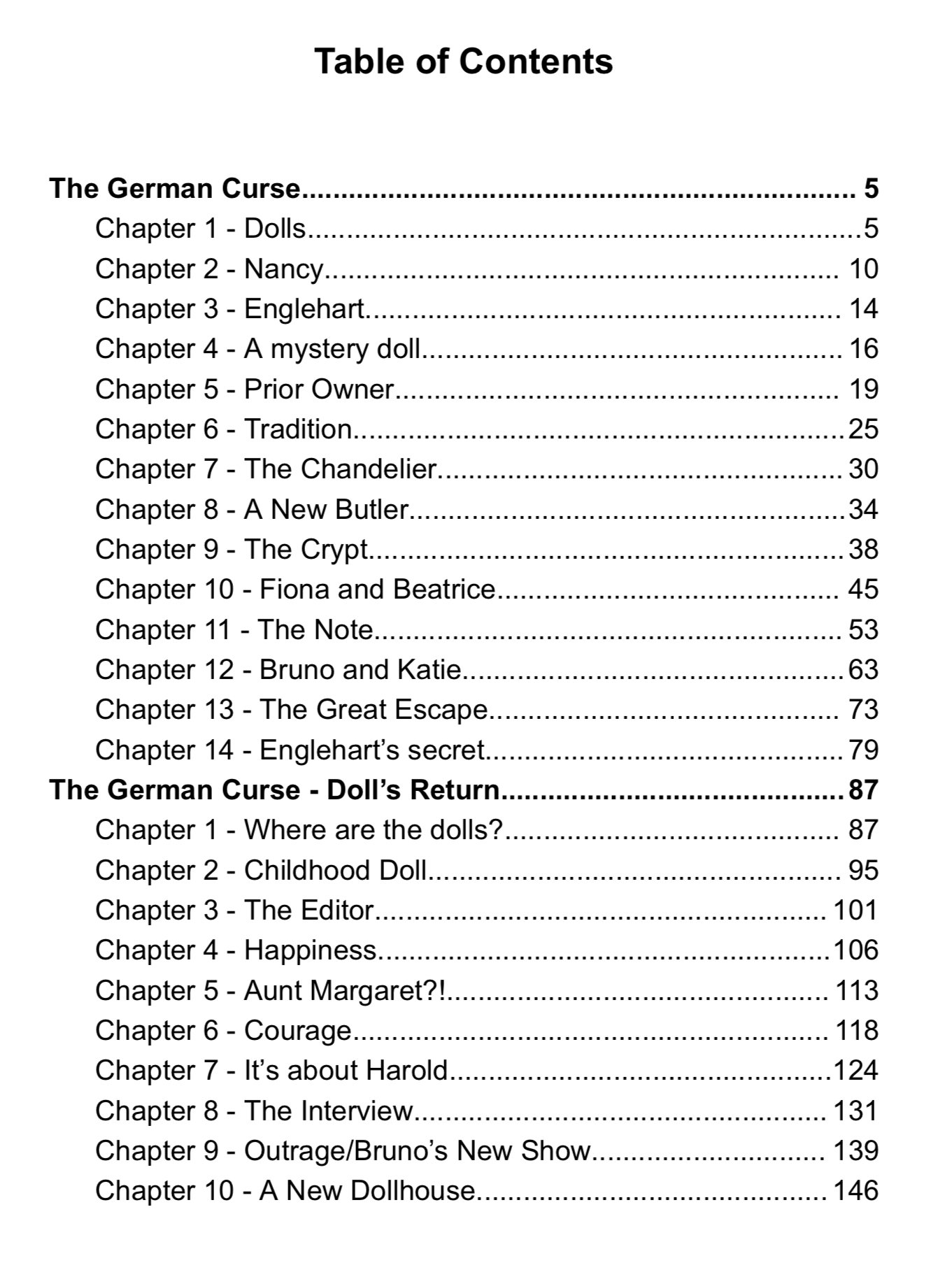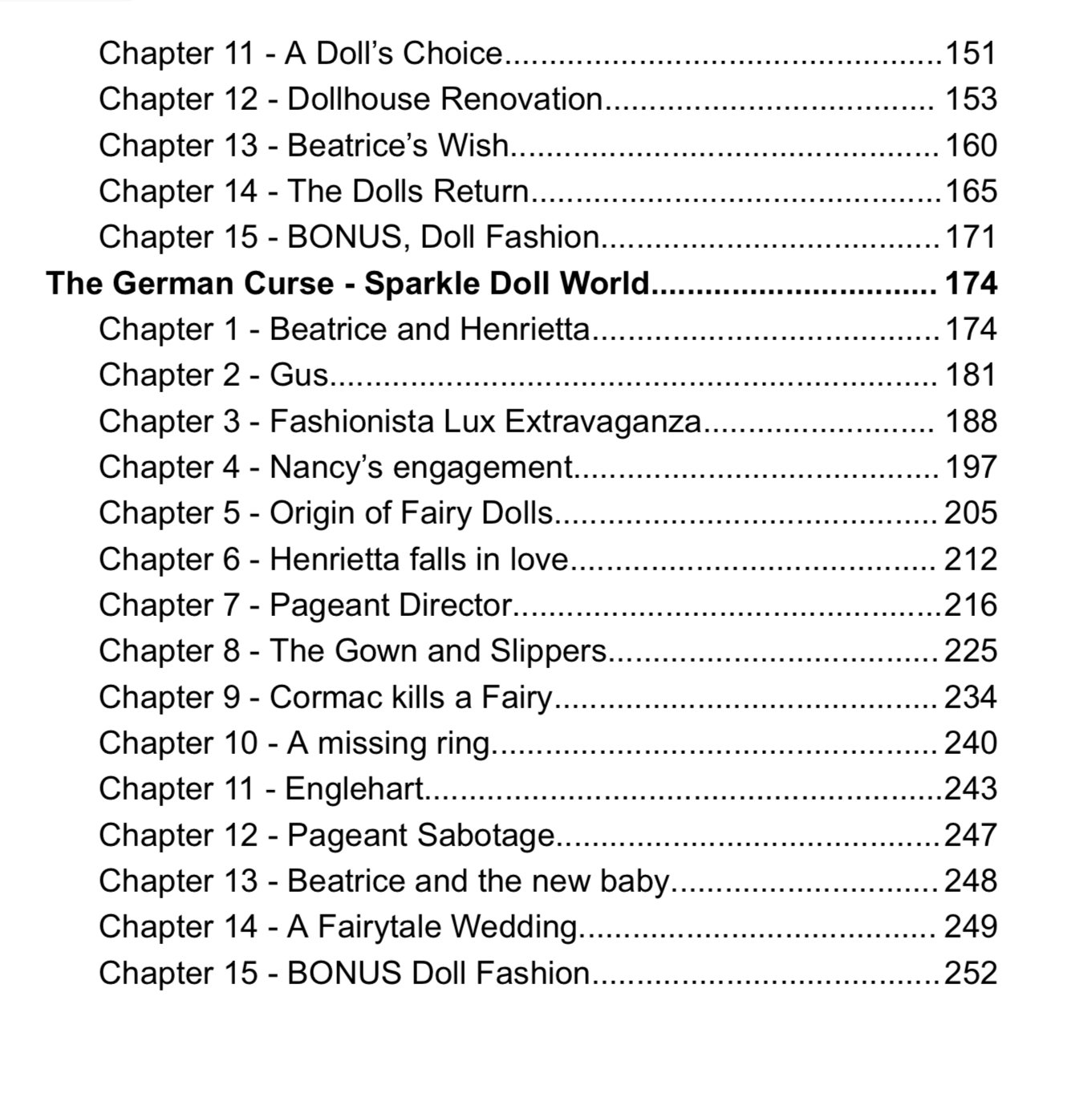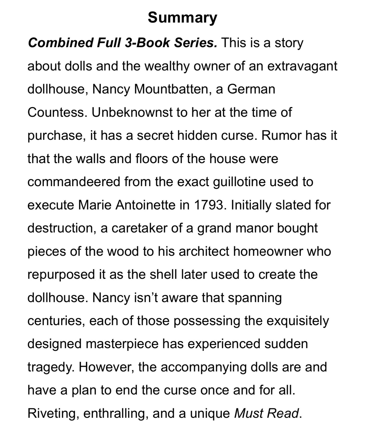 Combined Full 3-Book Series. This is a story about dolls and the wealthy owner of an extravagant dollhouse, Nancy Mountbatten, a German Countess. Unbeknownst to her at the time of purchase, it has a secret hidden curse. Rumor has it that the walls and floors of the house were commandeered from the exact guillotine used to execute Marie Antoinette in 1793. Initially slated for destruction, a caretaker of a grand manor bought pieces of the wood to his architect homeowner who repurposed it as the shell later used to create the dollhouse. Nancy isn’t aware that spanning centuries, each of those possessing the exquisitely designed masterpiece has experienced sudden tragedy. However, the accompanying dolls are and have a plan to end the curse once and for all. Riveting, enthralling, and a unique Must Read.