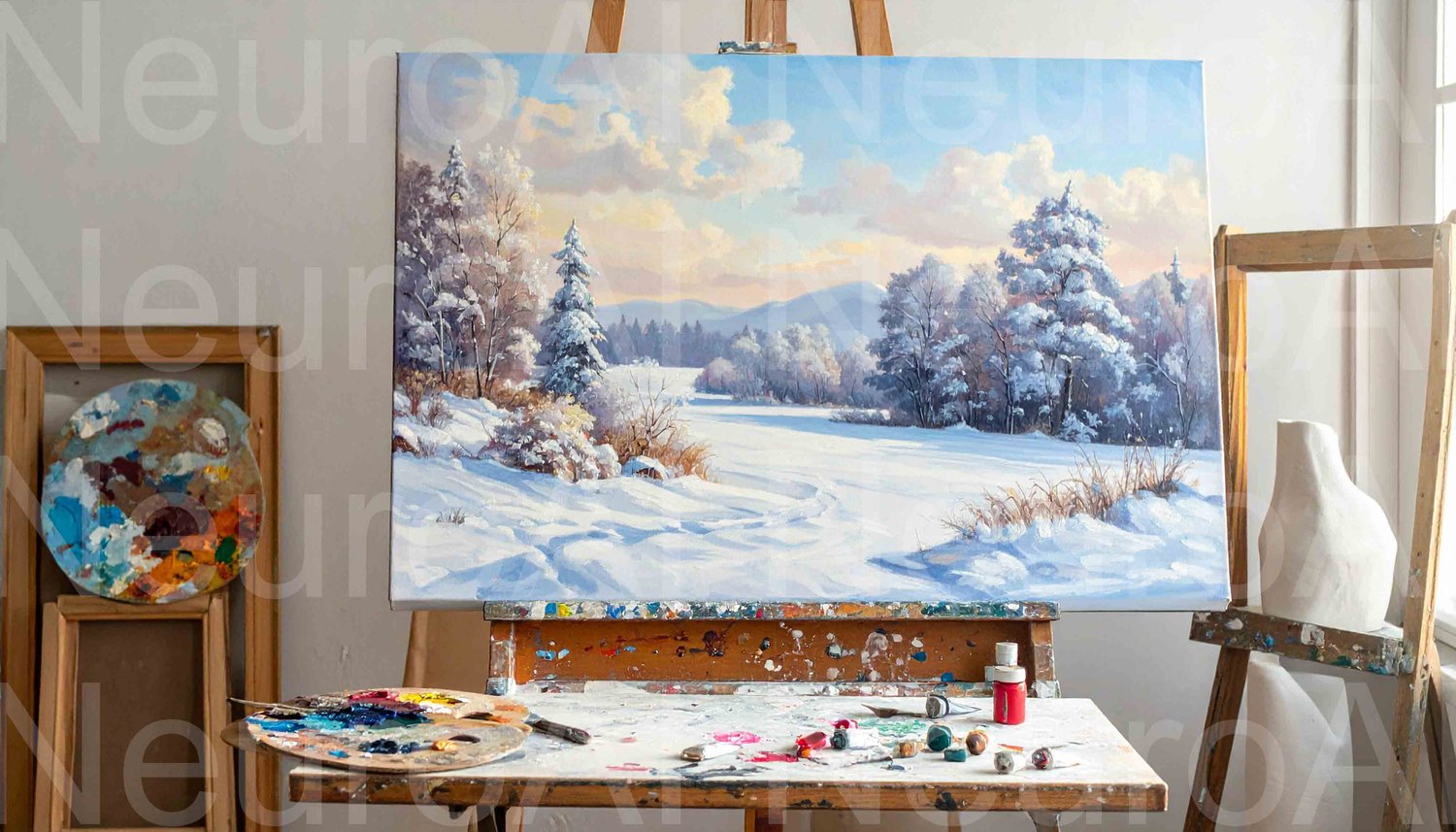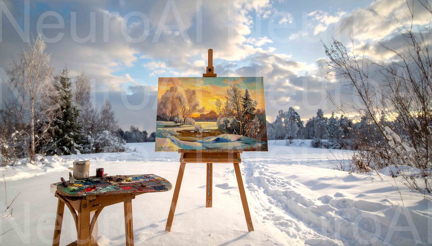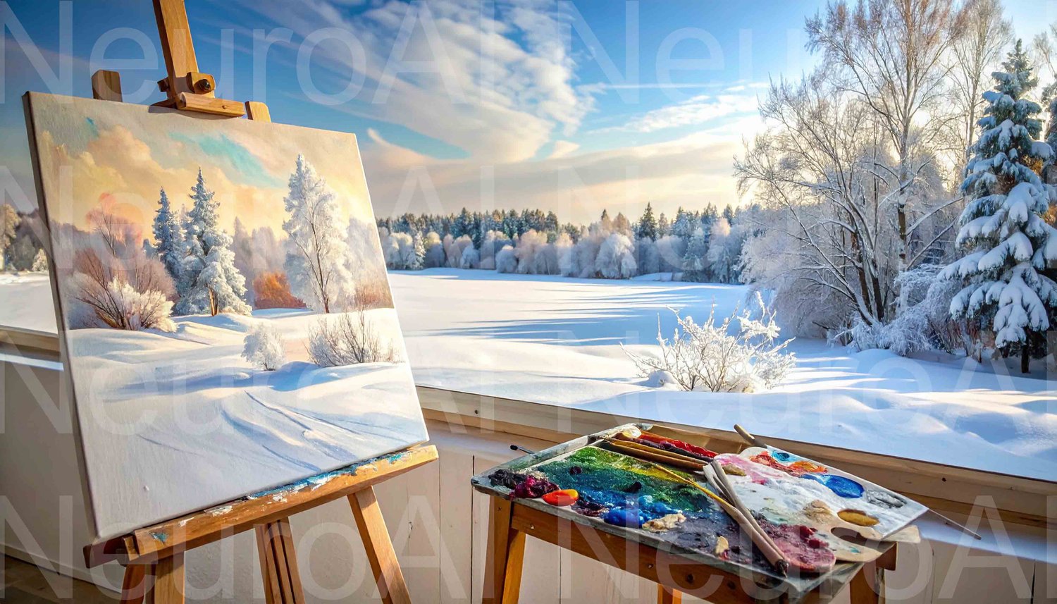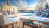 Winter landscape painting on easel in snowy field