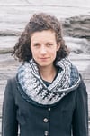 short cowl puffin / 1 skein each of crow 102 / frost 103 / kumlien’s gull 152 / damson 149 / long cowl puffin / 2 skeins of sabine 150 / 1 skein each of frost 103 / kumlien’s gull 152 / fjord 138