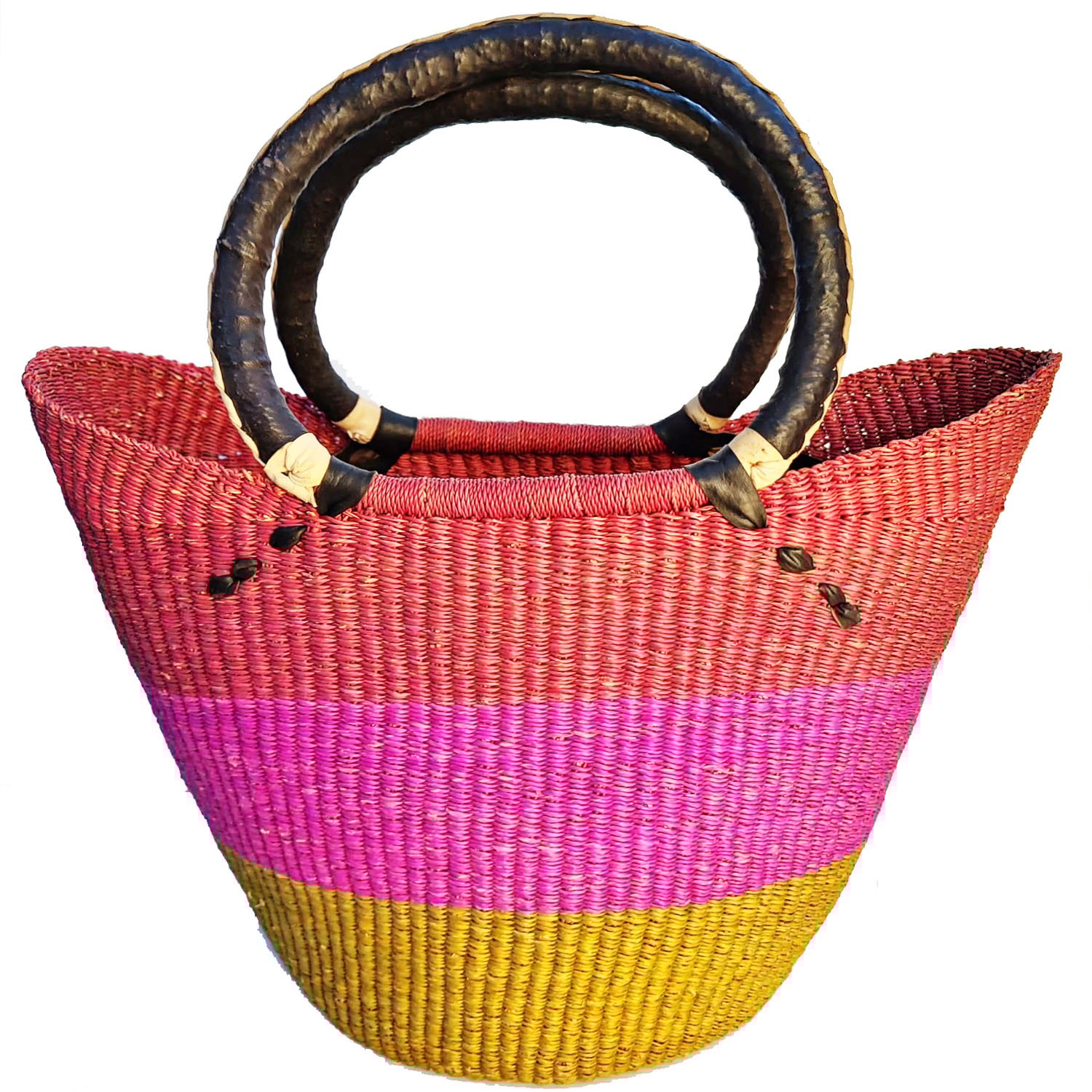 Inspired by the mesmerizing colors of the aurora, this tote combines a pink dawn, a purple twilight, and a yellow daybreak. The dark handles are like the night sky that makes the colors shine even brighter.