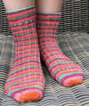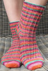 Sample was knit using Handdyed by MJ sokkenwol (420 meters (460 yards) per 100 grams, 75% wool/25% nylon). Sample is a size medium and has a 9 inch (23 cm) foot length. Sample used 63 grams and 264 meters (289 yards) of yarn.