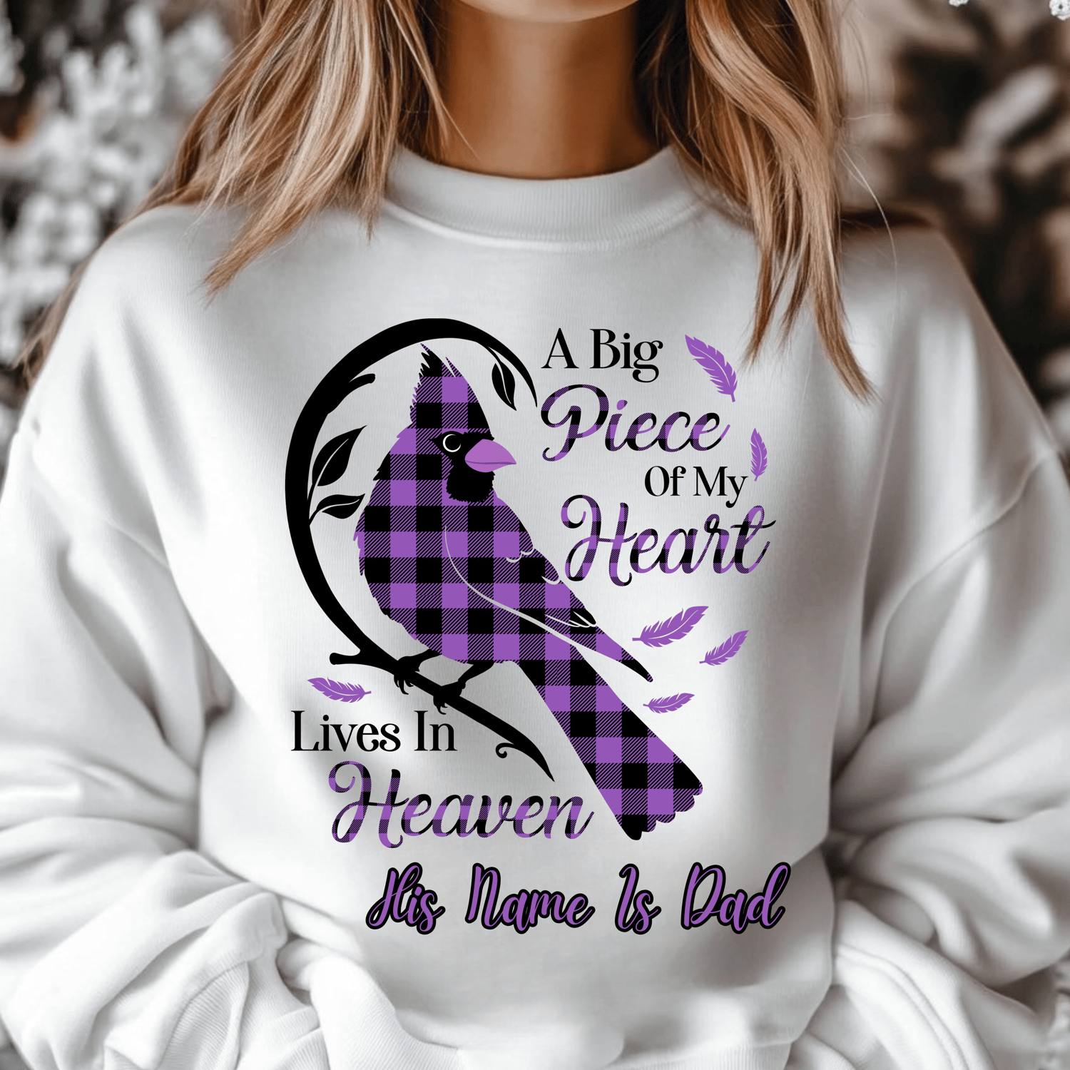 Finding ways to cope with the loss of a loved one is never easy. This Purple Cardinal Memorial Sweatshirt offers both comfort and meaning for those grieving the loss of a father. Featuring a plaid purple cardinal and the heartfelt saying “A Big Piece of My Heart Lives in Heaven, His Name is Dad”, this sweatshirt is designed to help keep your dad’s memory close while wrapping you in warmth.