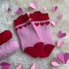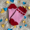 This pattern is worked in the round from the cuff down. The socks feature an afterthought heel which can be made to look like a heart through duplicate stitching. On the leg there is a band of stranded hearts. The toe is also made to look like a heart through stranded knitting.