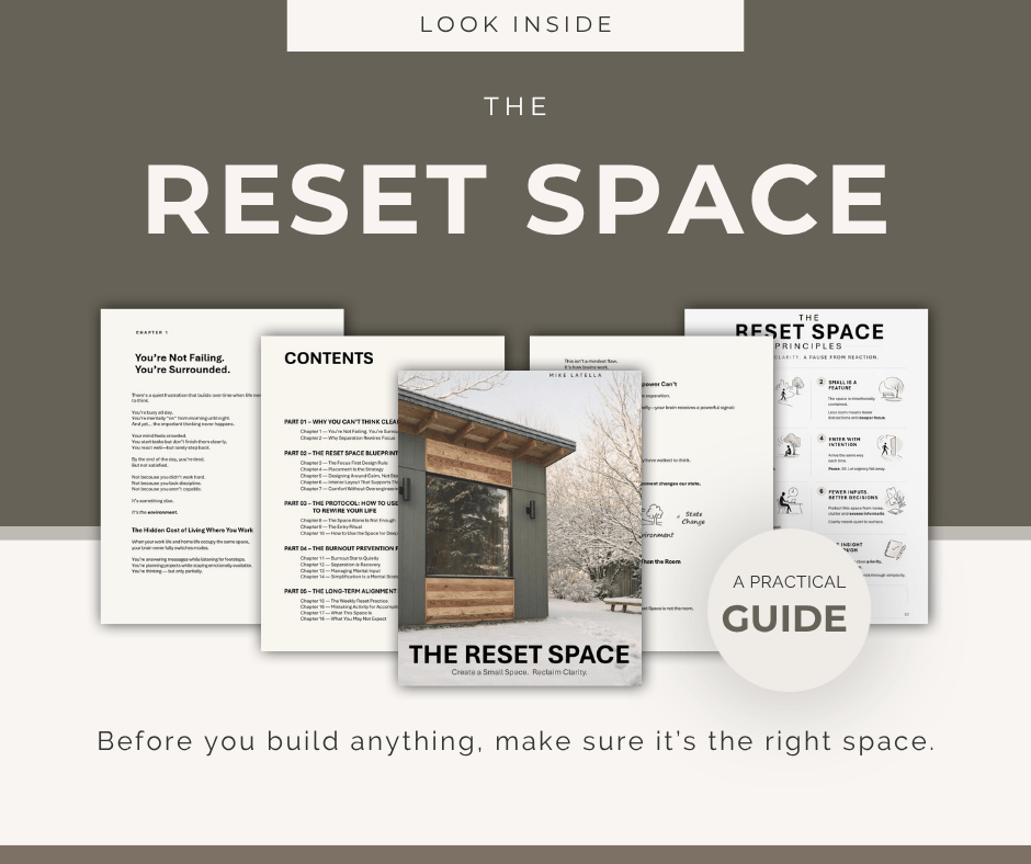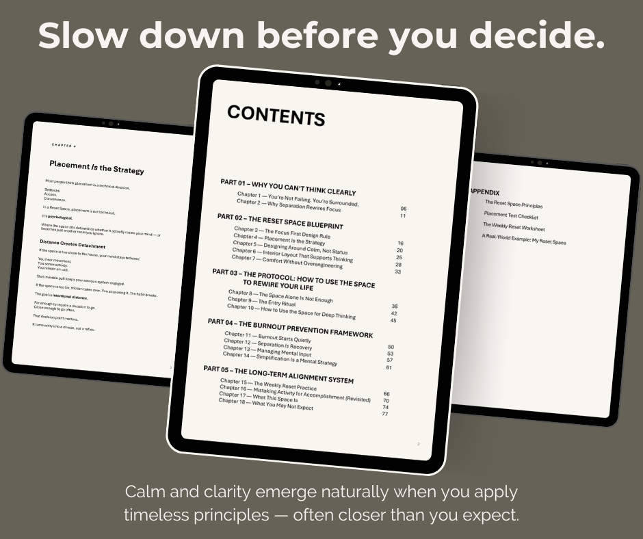 The Reset Space is a practical thinking guide that shows how intentionally designed separation, not more effort, creates better focus, calmer decisions, and clearer direction.