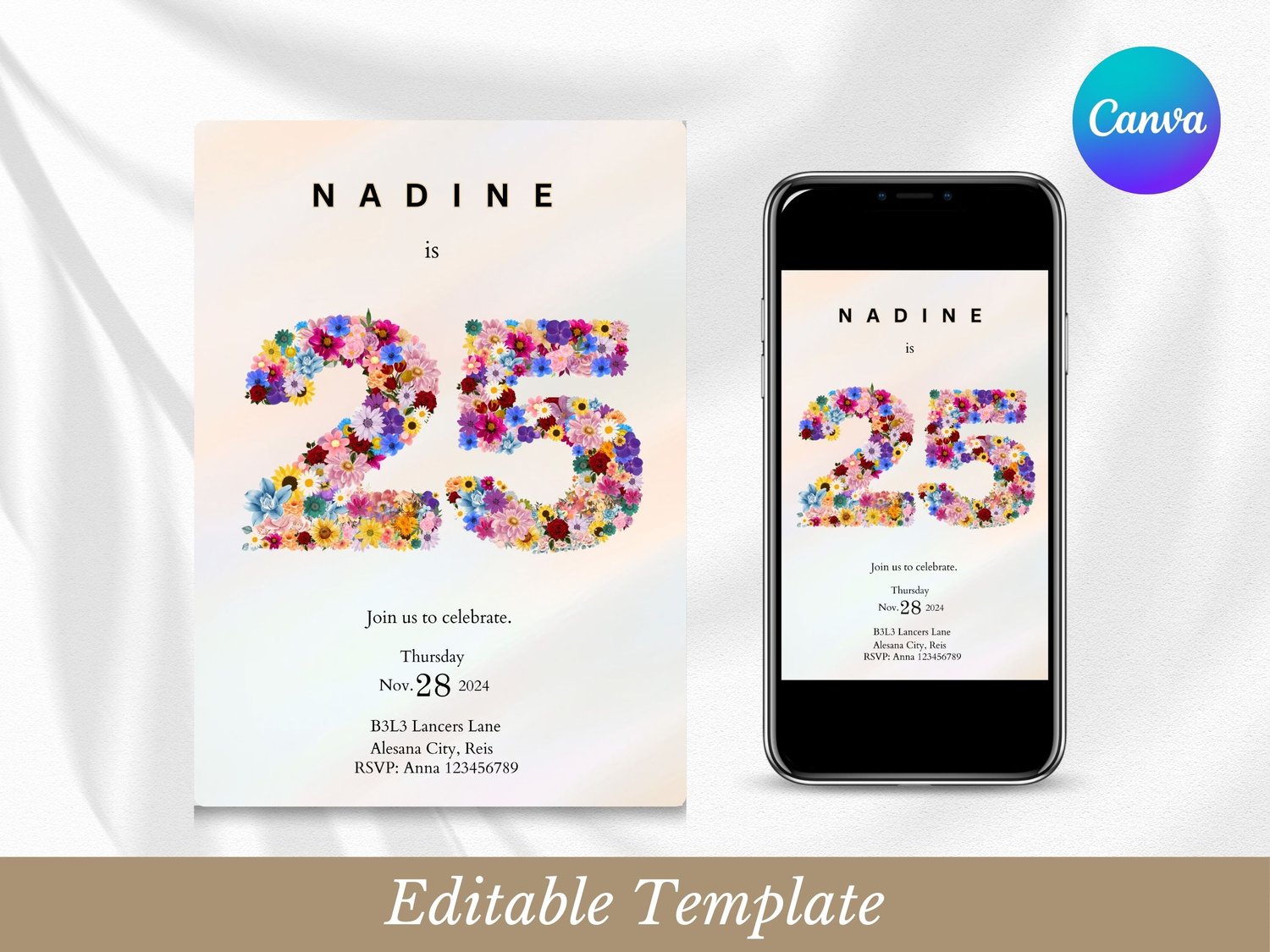 Floral 25th Birthday Invitation Template | Editable 25 Birthday Invite | Spring Milestone Birthday Invitation | Printable Birthday Card