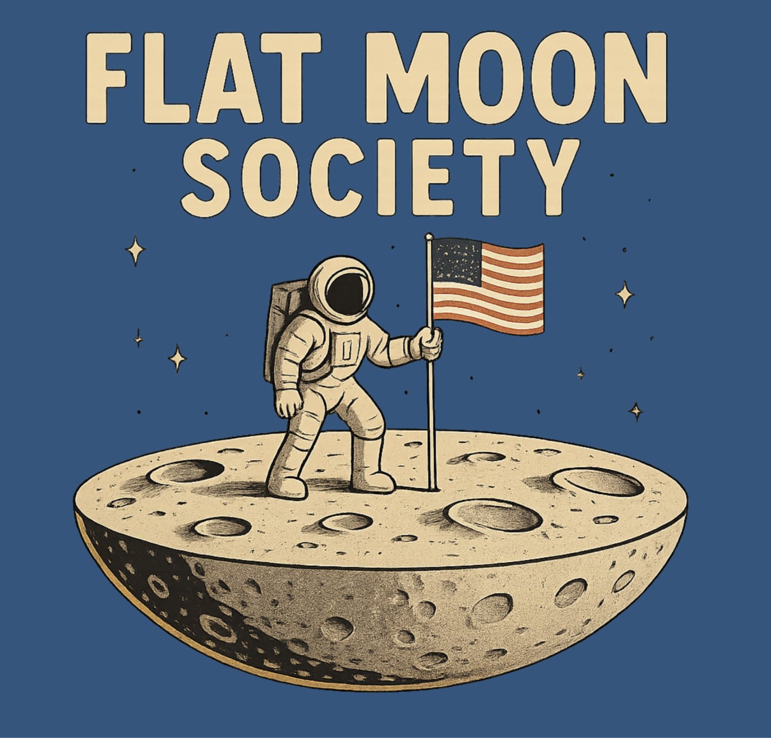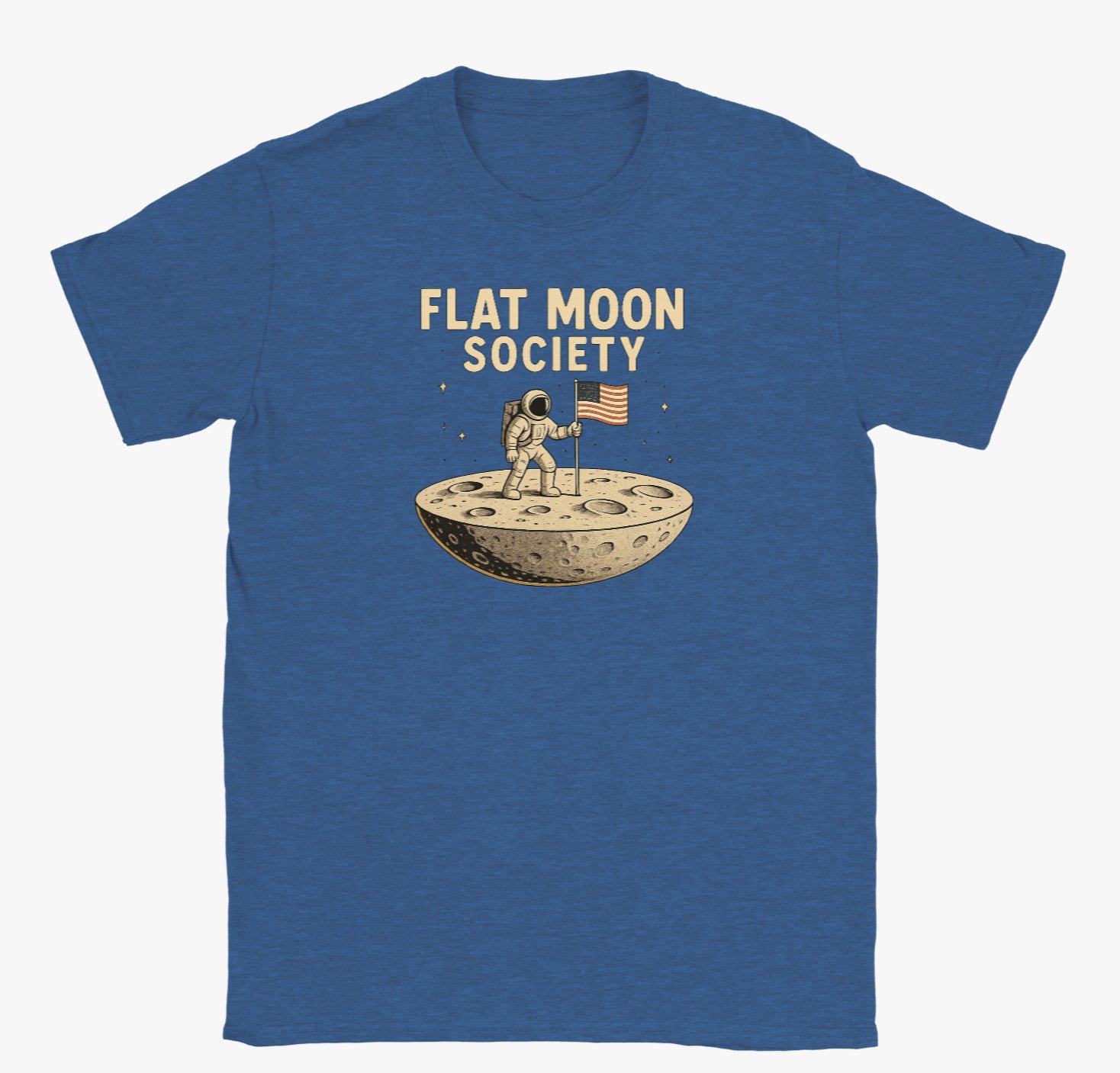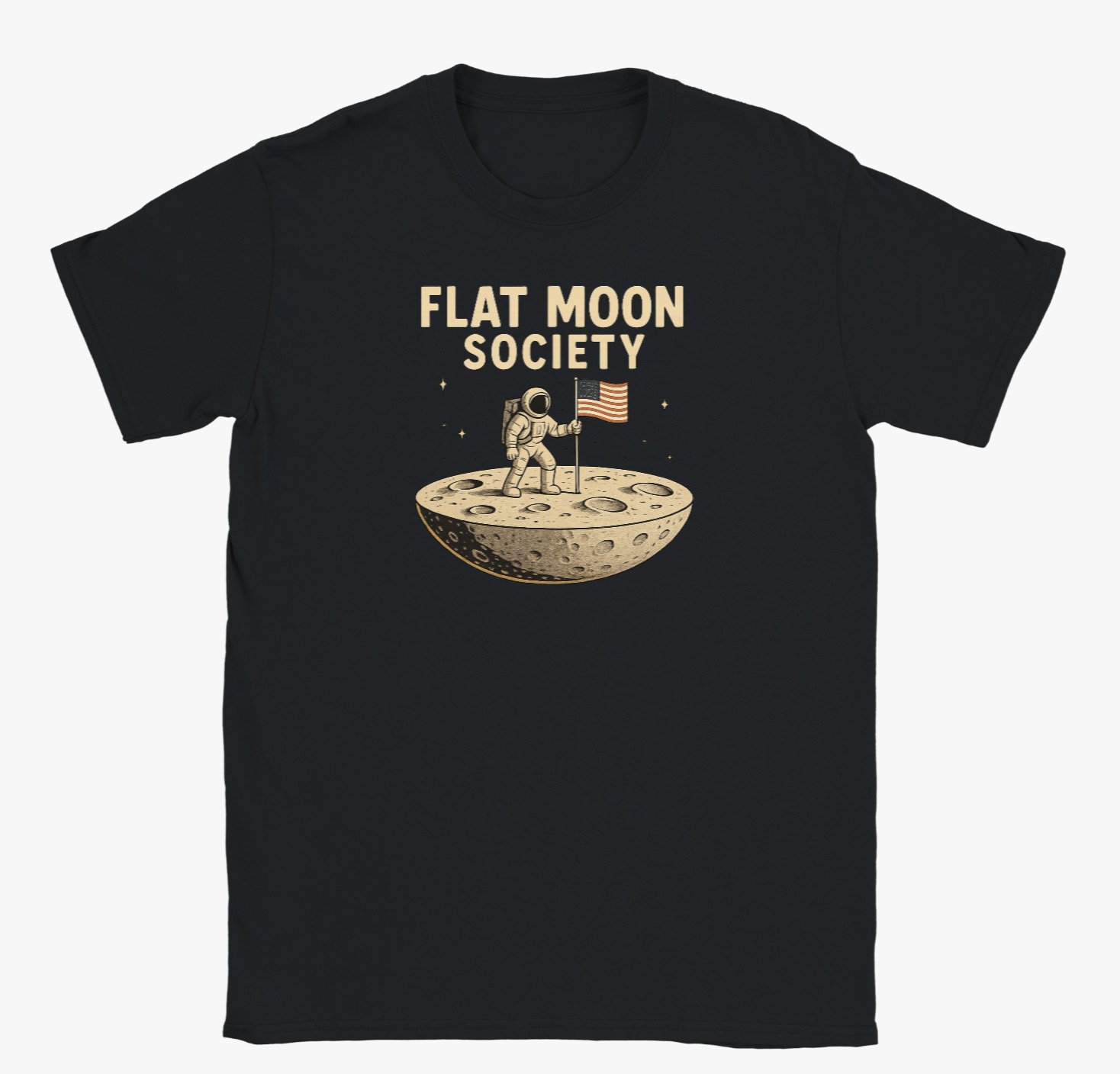 Show off your sense of humour and love for quirky space-themed designs with this Flat Moon Society t-shirt. Featuring a vintage-style illustration of an astronaut planting a flag on a comically flattened moon, this tee blends retro charm with playful satire. Perfect for science fans, space enthusiasts, or anyone who appreciates a clever twist on cosmic conspiracies.