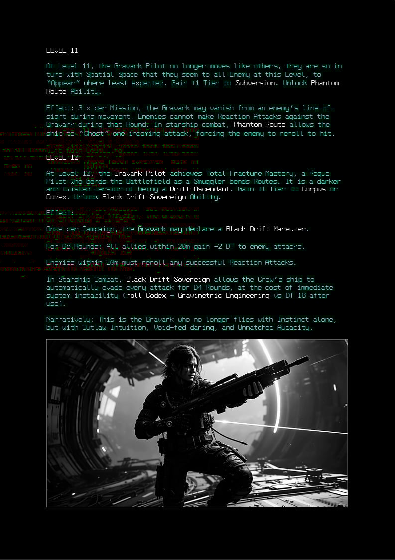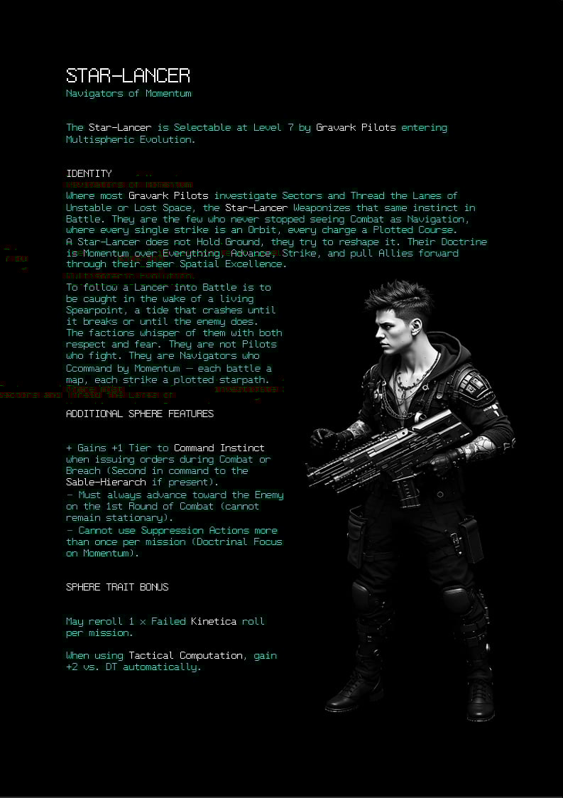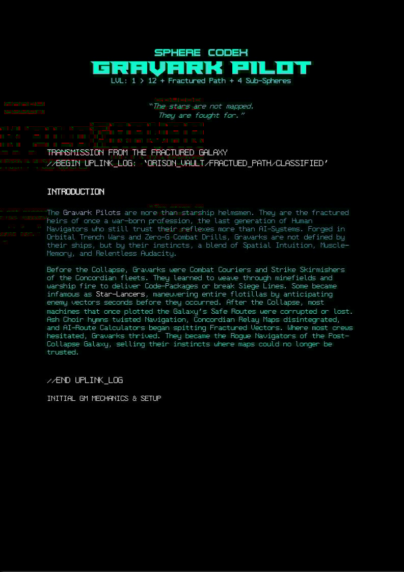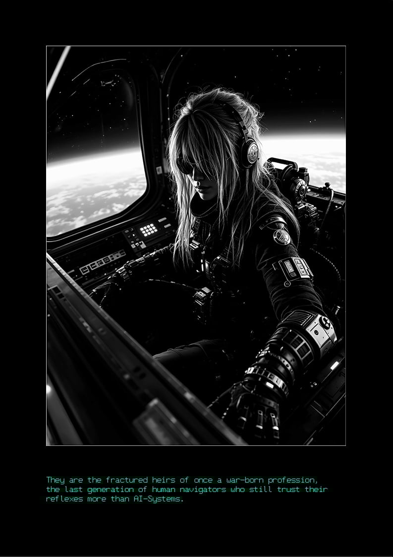 The Gravark Pilots are more than starship helmsmen. They are the fractured heirs of once a war-born profession, the last generation of Human Navigators who still trust their reflexes more than AI-Systems. Forged in Orbital Trench Wars and Zero-G Combat Drills, Gravarks are not defined by their ships, but by their instincts,