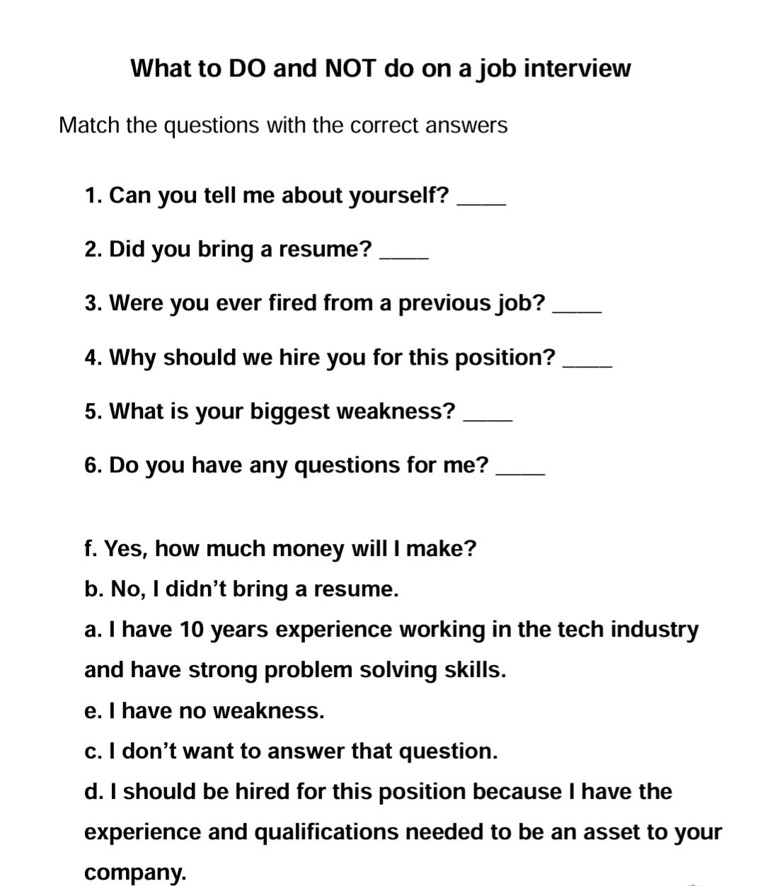 Job Interview Worksheets