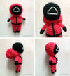 This doll is an adorable, mini version of the pink and black outfitted workers in the popular Korean horror TV series on Netflix. The Squid Game character features a removable hood and minimal sewing, requiring sewing only for the arms and head. The PDF pattern includes full written instructions and photo references for making the worker doll.