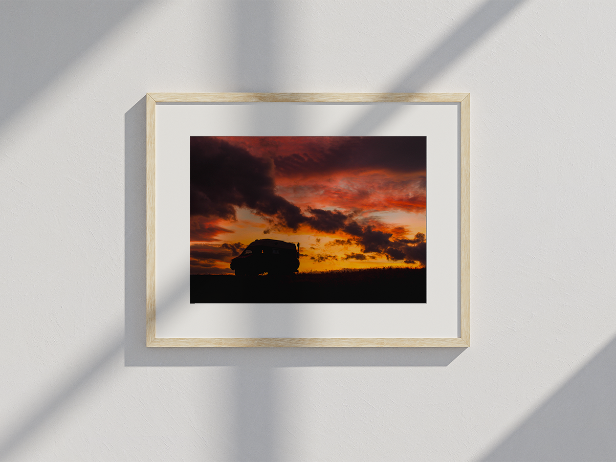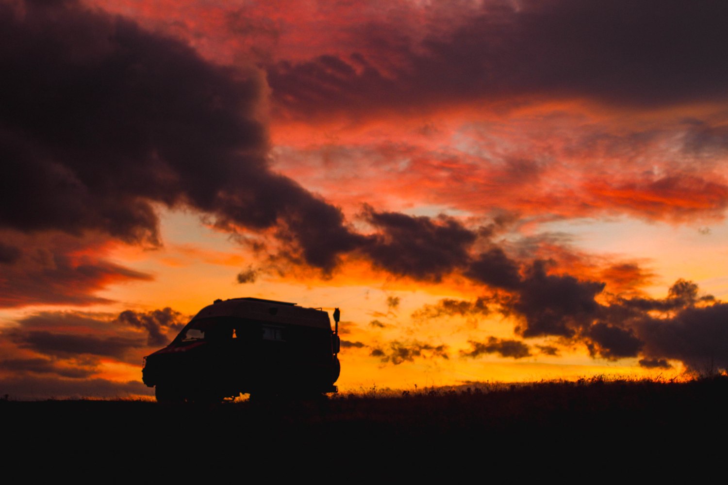 À cet instant-là, je me suis éloigné de Marco, mon petit chez-moi sur roues, pour prendre du recul et saisir cette scène. La terre, devant moi, était devenue noire, totalement à contre-jour. Et sur cette bande sombre, trônait la silhouette de Marco, entièrement découpée, comme gravée dans l’obscurité. Il n’y avait plus aucun détail, juste cette forme familière, solide, ancrée sur la crête, face au ciel embrasé.