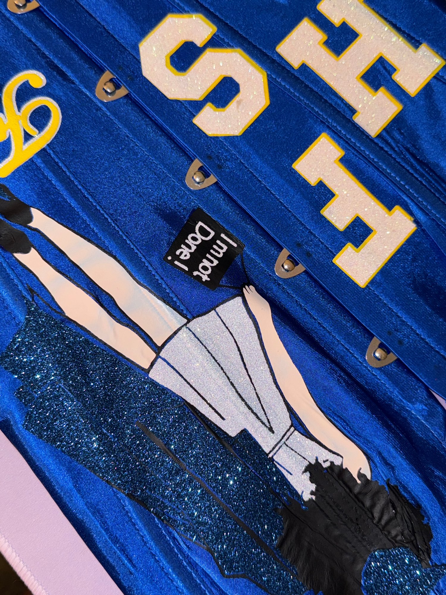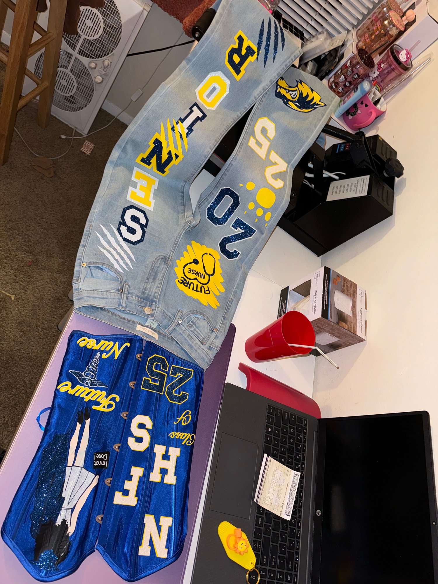 This is for a custom corset and jean set, jeans and corset are included in the price as well as any additional supplies i will use to make them. You can choose 2 or 3 vinyl colors you want as well as if you want full glitter or solid colors. Please be sure to leave an email or phone number you can be reached at to go over your design wants. Anything additional like boas, flair, back design, chains, etc. will cause an increase in price.