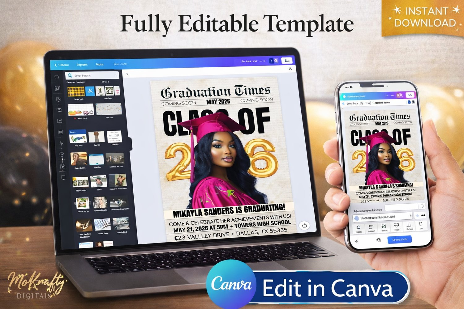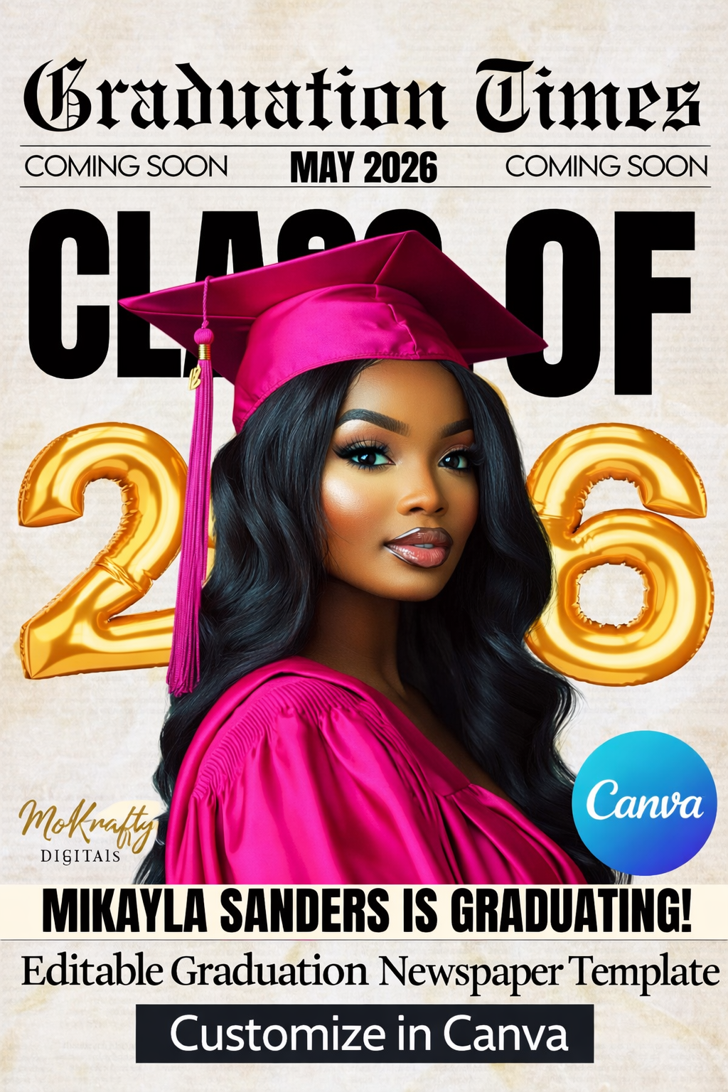 Editable Graduation Newspaper Template – Class of 2026 Canva Graduation Announcement & Grad Party Invite