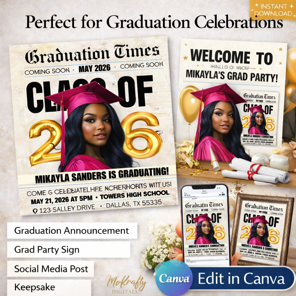 Celebrate your graduate in style with this Editable Graduation Newspaper Template for the Class of 2026. Easily customize the graduate’s name, photo, school, and event details using Canva.