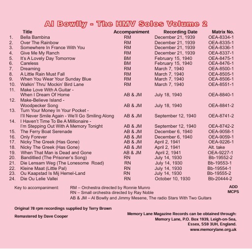 Here is the fourth and final release featuring recordings made by Al Bowlly under his own name. These include the last records he made before his untimely death just less than two weeks later. It also includes five recordings he made for the South African market in 1930, which very rare.