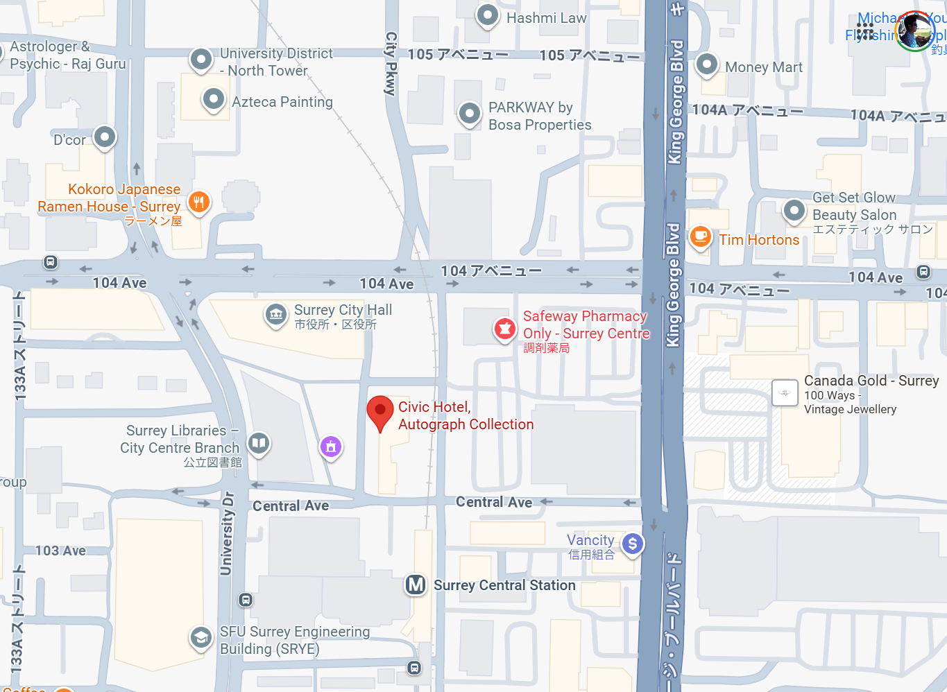 サレー中央駅出口(図書館側)を出ると目の前にCivic Hotelがあります。